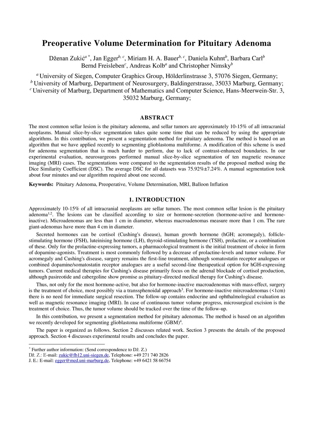 The most common sellar lesion is the pituitary adenoma, and sellar tumors are approximately 10-15% of all intracranial neoplasms. Manual slice-by-slice segmentation takes quite some time that can be reduced by using the appropriate algorithms. In this contribution, we present a segmentation method for pituitary adenoma. The method is based on an algorithm that we have applied recently to segmenting glioblastoma multiforme. A modification of this scheme is used for adenoma segmentation that is much harder to perform, due to lack of contrast-enhanced boundaries. In our experimental evaluation, neurosurgeons performed manual slice-by-slice segmentation of ten magnetic resonance imaging (MRI) cases. The segmentations were compared to the segmentation results of the proposed method using the Dice Similarity Coefficient (DSC). The average DSC for all datasets was 75.92% +/- 7.24%. A manual segmentation took about four minutes and our algorithm required about one second.