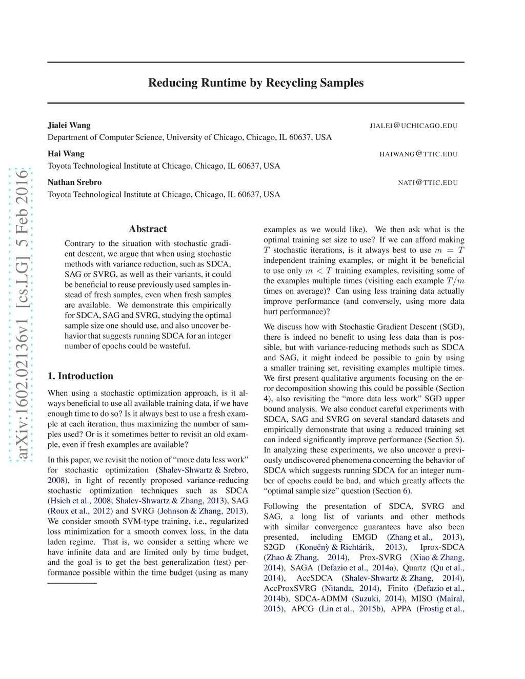 Contrary to the situation with stochastic gradient descent, we argue that when using stochastic methods with variance reduction, such as SDCA, SAG or SVRG, as well as their variants, it could be beneficial to reuse previously used samples instead of fresh samples, even when fresh samples are available. We demonstrate this empirically for SDCA, SAG and SVRG, studying the optimal sample size one should use, and also uncover be-havior that suggests running SDCA for an integer number of epochs could be wasteful.