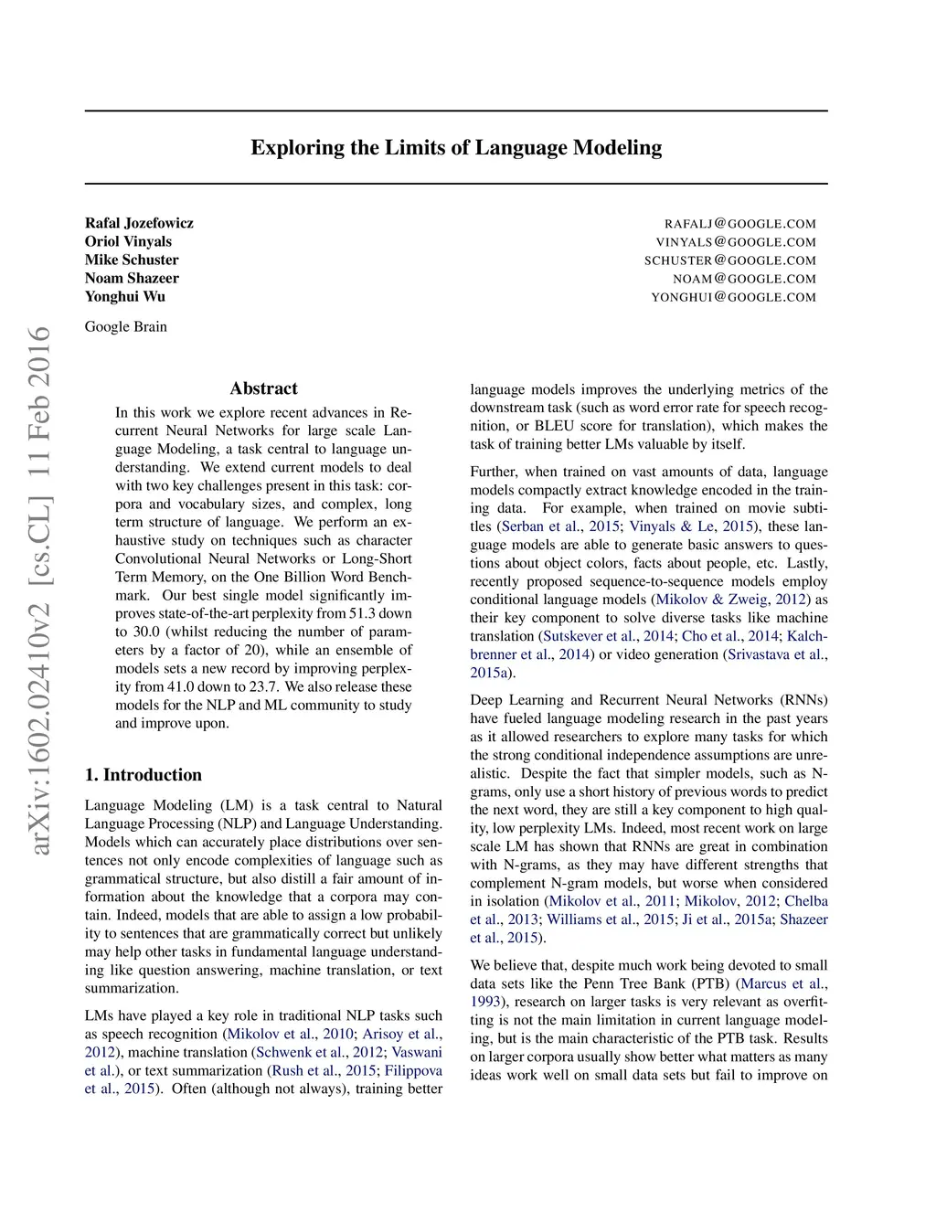 In this work we explore recent advances in Recurrent Neural Networks for large scale Language Modeling, a task central to language understanding. We extend current models to deal with two key challenges present in this task: corpora and vocabulary sizes, and complex, long term structure of language. We perform an exhaustive study on techniques such as character Convolutional Neural Networks or Long-Short Term Memory, on the One Billion Word Benchmark. Our best single model significantly improves state-of-the-art perplexity from 51.3 down to 30.0 (whilst reducing the number of parameters by a factor of 20), while an ensemble of models sets a new record by improving perplexity from 41.0 down to 23.7. We also release these models for the NLP and ML community to study and improve upon.