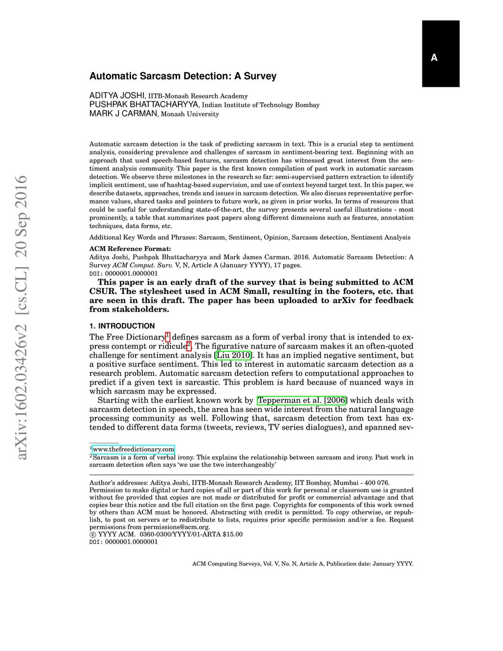 Automatic Sarcasm Detection: A Survey