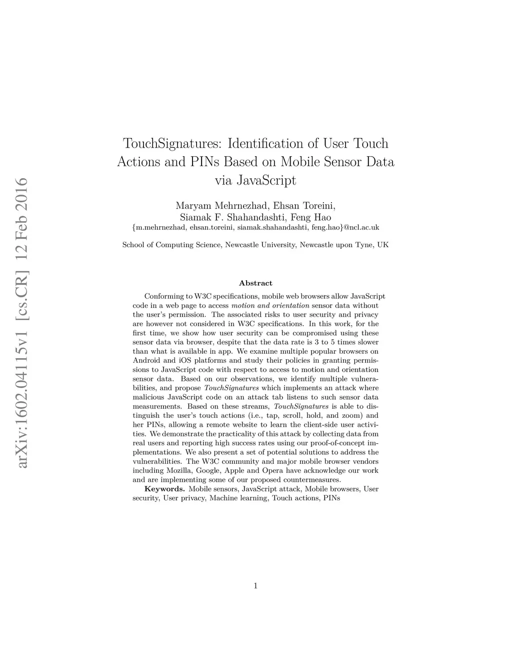 TouchSignatures: Identification of User Touch Actions and PINs Based on