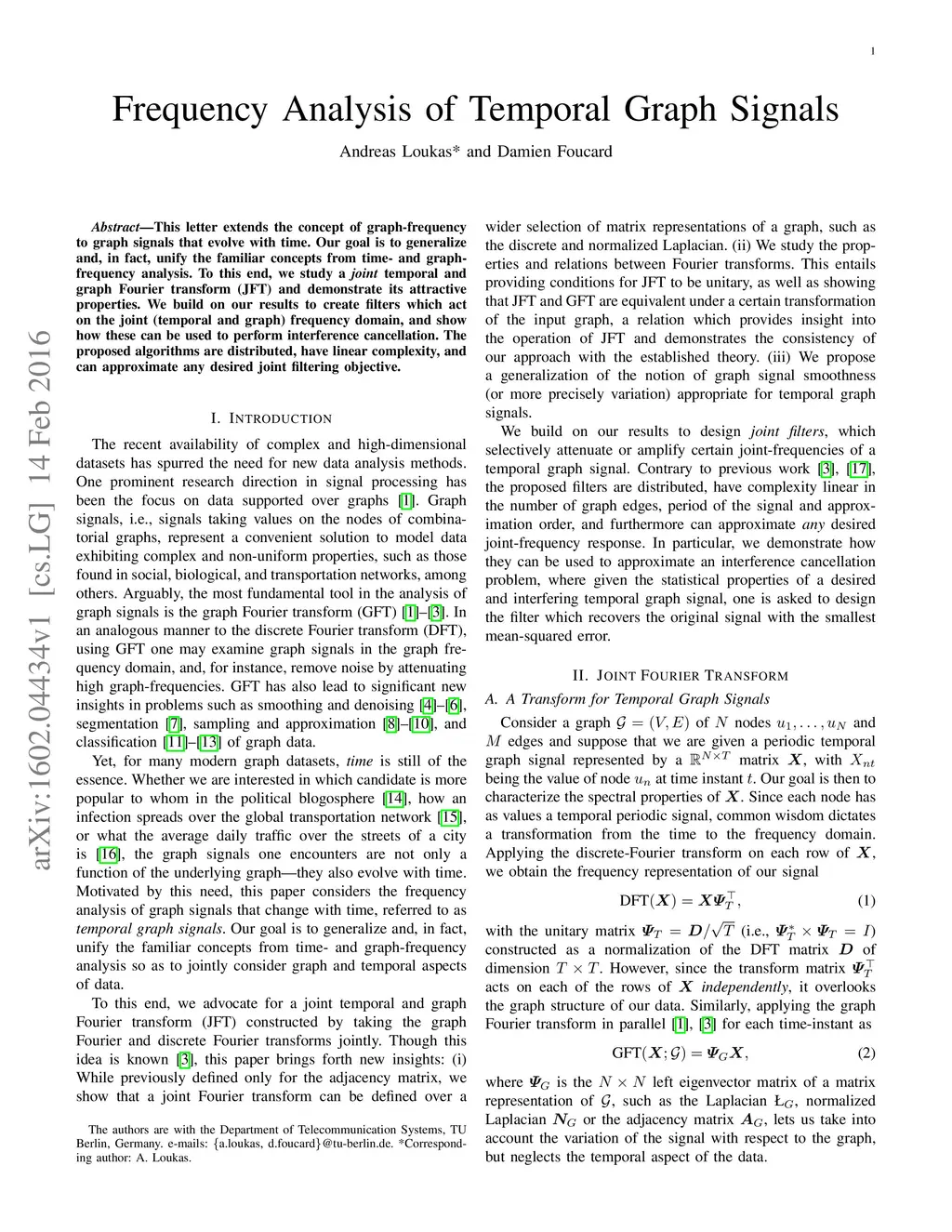 This letter extends the concept of graph-frequency to graph signals that evolve with time. Our goal is to generalize and, in fact, unify the familiar concepts from time- and graph-frequency analysis. To this end, we study a joint temporal and graph Fourier transform (JFT) and demonstrate its attractive properties. We build on our results to create filters which act on the joint (temporal and graph) frequency domain, and show how these can be used to perform interference cancellation. The proposed algorithms are distributed, have linear complexity, and can approximate any desired joint filtering objective.