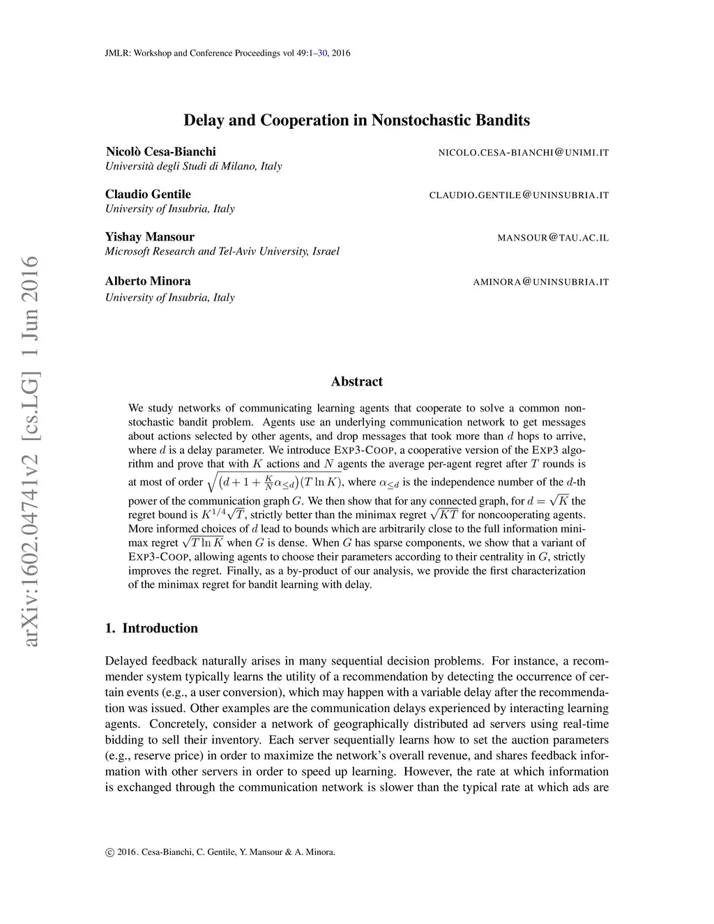 We study networks of communicating learning agents that cooperate to solve a common nonstochastic bandit problem. Agents use an underlying communication network to get messages about actions selected by other agents, and drop messages that took more than hops to arrive, where is a delay parameter. We introduce \textsc{Exp3-Coop}, a cooperative version of the {\sc Exp3} algorithm and prove that with actions and agents the average per-agent regret after rounds is at most of order , where is the independence number of the -th power of the connected communication graph . We then show that for any connected graph, for the regret bound is , strictly better than the minimax regret for noncooperating agents. More informed choices of lead to bounds which are arbitrarily close to the full information minimax regret when is dense. When has sparse components, we show that a variant of \textsc{Exp3-Coop}, allowing agents to choose their parameters according to their centrality in , strictly improves the regret. Finally, as a by-product of our analysis, we provide the first characterization of the minimax regret for bandit learning with delay.