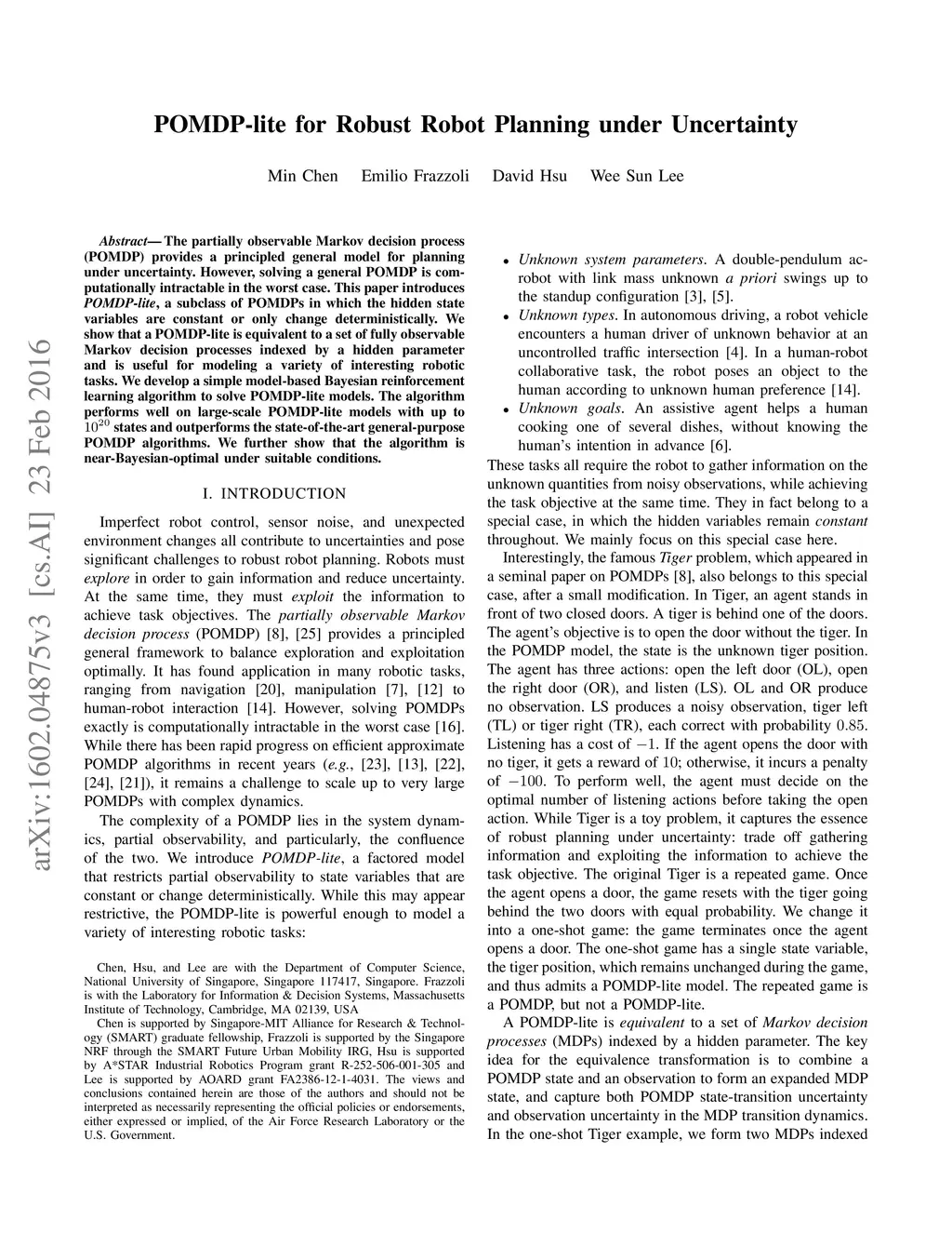 POMDP-lite for Robust Robot Planning under Uncertainty