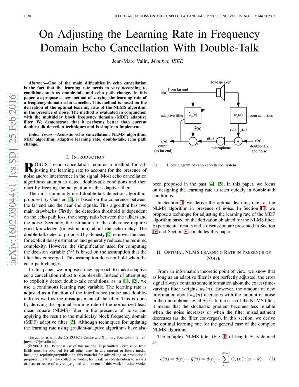 One of the main difficulties in echo cancellation is the fact that the learning rate needs to vary according to conditions such as double-talk and echo path change. In this paper we propose a new method of varying the learning rate of a frequency-domain echo canceller. This method is based on the derivation of the optimal learning rate of the NLMS algorithm in the presence of noise. The method is evaluated in conjunction with the multidelay block frequency domain (MDF) adaptive filter. We demonstrate that it performs better than current double-talk detection techniques and is simple to implement.