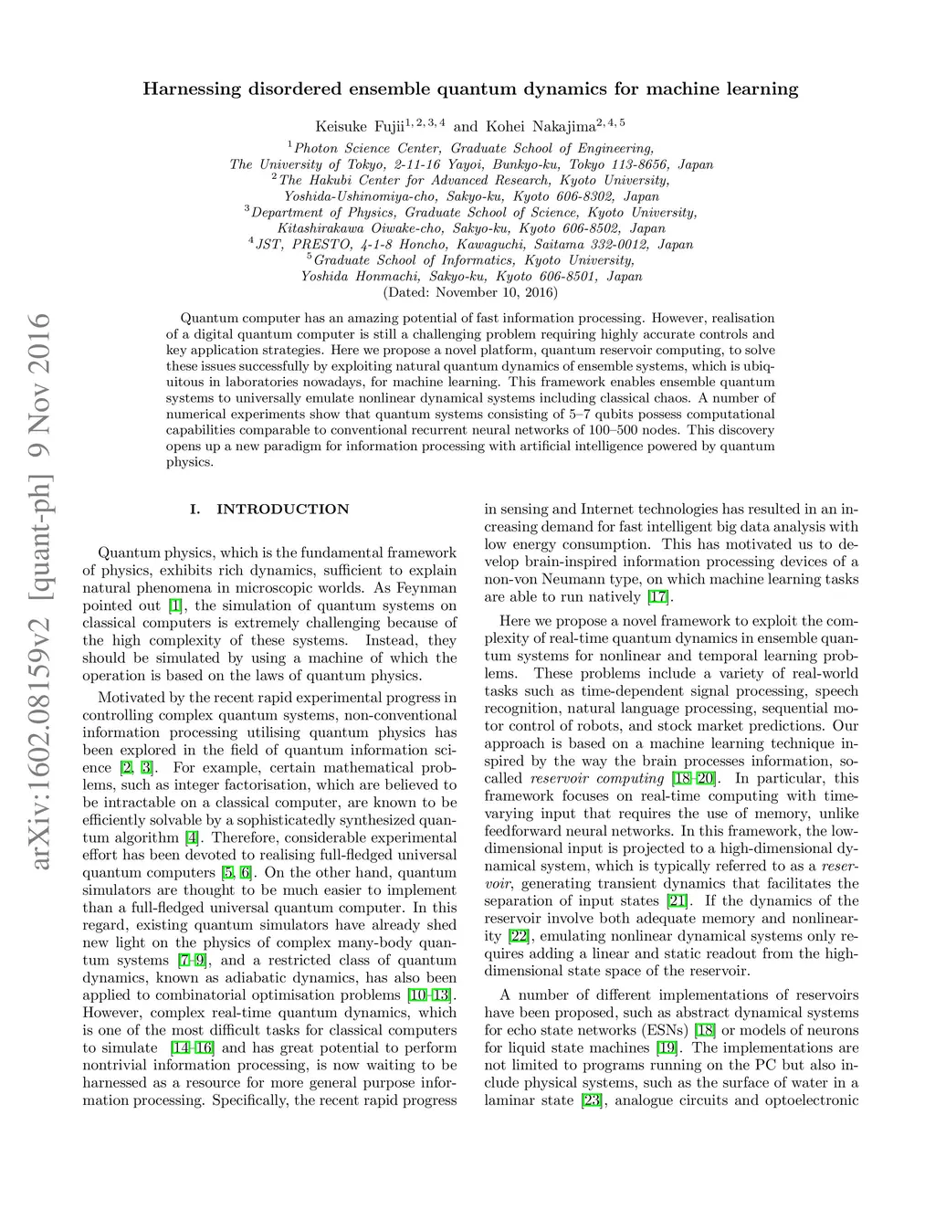 Quantum computer has an amazing potential of fast information processing. However, realisation of a digital quantum computer is still a challenging problem requiring highly accurate controls and key application strategies. Here we propose a novel platform, quantum reservoir computing, to solve these issues successfully by exploiting natural quantum dynamics, which is ubiquitous in laboratories nowadays, for machine learning. In this framework, nonlinear dynamics including classical chaos can be universally emulated in quantum systems. A number of numerical experiments show that quantum systems consisting of at most seven qubits possess computational capabilities comparable to conventional recurrent neural networks of 500 nodes. This discovery opens up a new paradigm for information processing with artificial intelligence powered by quantum physics.