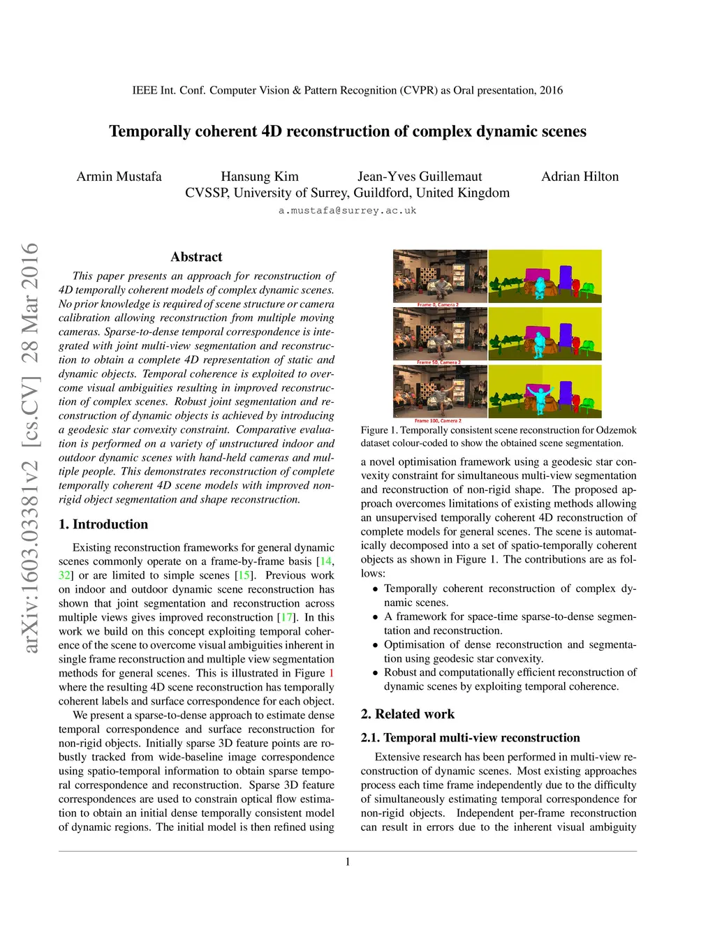 This paper presents an approach for reconstruction of 4D temporally coherent models of complex dynamic scenes. No prior knowledge is required of scene structure or camera calibration allowing reconstruction from multiple moving cameras. Sparse-to-dense temporal correspondence is integrated with joint multi-view segmentation and reconstruction to obtain a complete 4D representation of static and dynamic objects. Temporal coherence is exploited to overcome visual ambiguities resulting in improved reconstruction of complex scenes. Robust joint segmentation and reconstruction of dynamic objects is achieved by introducing a geodesic star convexity constraint. Comparative evaluation is performed on a variety of unstructured indoor and outdoor dynamic scenes with hand-held cameras and multiple people. This demonstrates reconstruction of complete temporally coherent 4D scene models with improved nonrigid object segmentation and shape reconstruction.