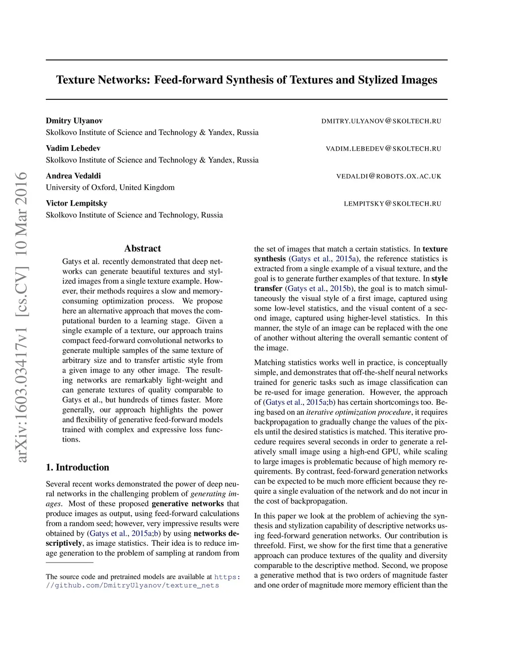 Texture Networks: Feed-forward Synthesis of Textures and Stylized Images