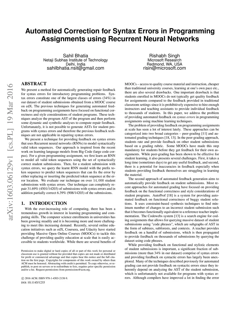 We present a method for automatically generating repair feedback for syntax errors for introductory programming problems. Syntax errors constitute one of the largest classes of errors (34%) in our dataset of student submissions obtained from a MOOC course on edX. The previous techniques for generating automated feed- back on programming assignments have focused on functional correctness and style considerations of student programs. These techniques analyze the program AST of the program and then perform some dynamic and symbolic analyses to compute repair feedback. Unfortunately, it is not possible to generate ASTs for student pro- grams with syntax errors and therefore the previous feedback techniques are not applicable in repairing syntax errors. We present a technique for providing feedback on syntax errors that uses Recurrent neural networks (RNNs) to model syntactically valid token sequences. Our approach is inspired from the recent work on learning language models from Big Code (large code corpus). For a given programming assignment, we first learn an RNN to model all valid token sequences using the set of syntactically correct student submissions. Then, for a student submission with syntax errors, we query the learnt RNN model with the prefix to- ken sequence to predict token sequences that can fix the error by either replacing or inserting the predicted token sequence at the error location. We evaluate our technique on over 14, 000 student submissions with syntax errors. Our technique can completely re- pair 31.69% (4501/14203) of submissions with syntax errors and in addition partially correct 6.39% (908/14203) of the submissions.