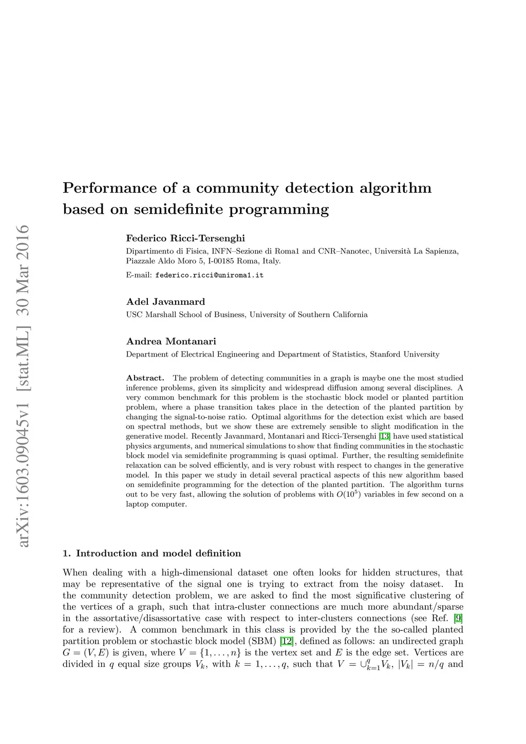 The problem of detecting communities in a graph is maybe one the most studied inference problems, given its simplicity and widespread diffusion among several disciplines. A very common benchmark for this problem is the stochastic block model or planted partition problem, where a phase transition takes place in the detection of the planted partition by changing the signal-to-noise ratio. Optimal algorithms for the detection exist which are based on spectral methods, but we show these are extremely sensible to slight modification in the generative model. Recently Javanmard, Montanari and Ricci-Tersenghi (arXiv:1511.08769) have used statistical physics arguments, and numerical simulations to show that finding communities in the stochastic block model via semidefinite programming is quasi optimal. Further, the resulting semidefinite relaxation can be solved efficiently, and is very robust with respect to changes in the generative model. In this paper we study in detail several practical aspects of this new algorithm based on semidefinite programming for the detection of the planted partition. The algorithm turns out to be very fast, allowing the solution of problems with variables in few second on a laptop computer.