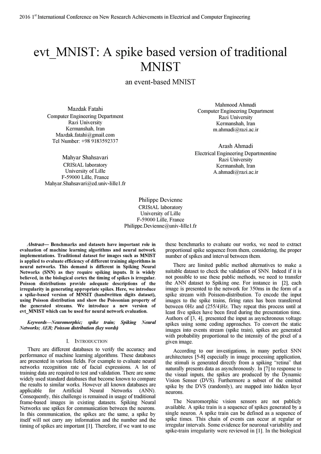 Benchmarks and datasets have important role in evaluation of machine learning algorithms and neural network implementations. Traditional dataset for images such as MNIST is applied to evaluate efficiency of different training algorithms in neural networks. This demand is different in Spiking Neural Networks (SNN) as they require spiking inputs. It is widely believed, in the biological cortex the timing of spikes is irregular. Poisson distributions provide adequate descriptions of the irregularity in generating appropriate spikes. Here, we introduce a spike-based version of MNSIT (handwritten digits dataset),using Poisson distribution and show the Poissonian property of the generated streams. We introduce a new version of evt_MNIST which can be used for neural network evaluation.