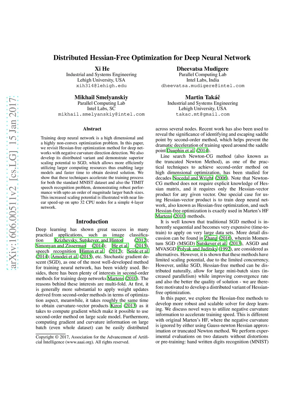 Training deep neural network is a high dimensional and a highly non-convex optimization problem. Stochastic gradient descent (SGD) algorithm and it's variations are the current state-of-the-art solvers for this task. However, due to non-covexity nature of the problem, it was observed that SGD slows down near saddle point. Recent empirical work claim that by detecting and escaping saddle point efficiently, it's more likely to improve training performance. With this objective, we revisit Hessian-free optimization method for deep networks. We also develop its distributed variant and demonstrate superior scaling potential to SGD, which allows more efficiently utilizing larger computing resources thus enabling large models and faster time to obtain desired solution. Furthermore, unlike truncated Newton method (Marten's HF) that ignores negative curvature information by using na\"ive conjugate gradient method and Gauss-Newton Hessian approximation information - we propose a novel algorithm to explore negative curvature direction by solving the sub-problem with stabilized bi-conjugate method involving possible indefinite stochastic Hessian information. We show that these techniques accelerate the training process for both the standard MNIST dataset and also the TIMIT speech recognition problem, demonstrating robust performance with upto an order of magnitude larger batch sizes. This increased scaling potential is illustrated with near linear speed-up on upto 16 CPU nodes for a simple 4-layer network.