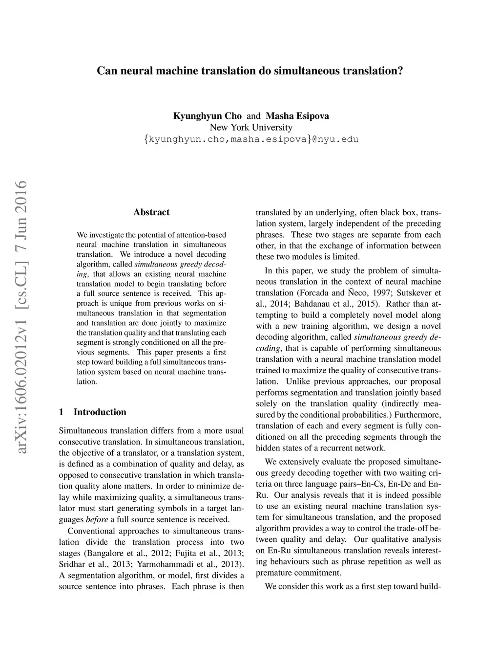 We investigate the potential of attention-based neural machine translation in simultaneous translation. We introduce a novel decoding algorithm, called simultaneous greedy decoding, that allows an existing neural machine translation model to begin translating before a full source sentence is received. This approach is unique from previous works on simultaneous translation in that segmentation and translation are done jointly to maximize the translation quality and that translating each segment is strongly conditioned on all the previous segments. This paper presents a first step toward building a full simultaneous translation system based on neural machine translation.