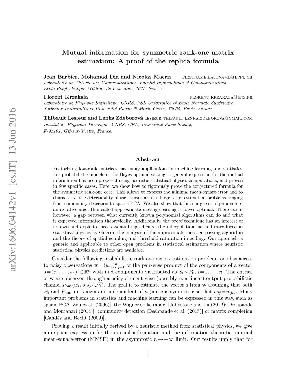 Factorizing low-rank matrices has many applications in machine learning and statistics. For probabilistic models in the Bayes optimal setting, a general expression for the mutual information has been proposed using heuristic statistical physics computations, and proven in few specific cases. Here, we show how to rigorously prove the conjectured formula for the symmetric rank-one case. This allows to express the minimal mean-square-error and to characterize the detectability phase transitions in a large set of estimation problems ranging from community detection to sparse PCA. We also show that for a large set of parameters, an iterative algorithm called approximate message-passing is Bayes optimal. There exists, however, a gap between what currently known polynomial algorithms can do and what is expected information theoretically. Additionally, the proof technique has an interest of its own and exploits three essential ingredients: the interpolation method introduced in statistical physics by Guerra, the analysis of the approximate message-passing algorithm and the theory of spatial coupling and threshold saturation in coding. Our approach is generic and applicable to other open problems in statistical estimation where heuristic statistical physics predictions are available.