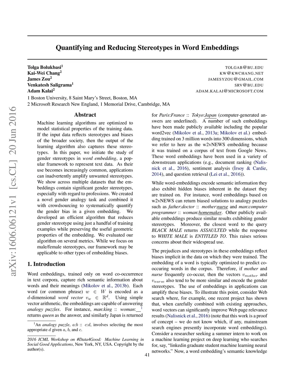 Quantifying and Reducing Stereotypes in Word Embeddings