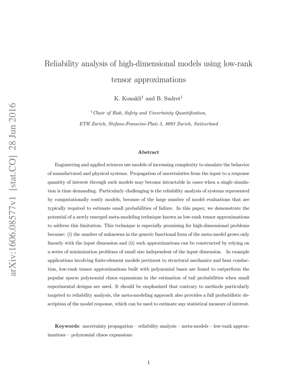 Engineering and applied sciences use models of increasing complexity to simulate the behaviour of manufactured and physical systems. Propagation of uncertainties from the input to a response quantity of interest through such models may become intractable in cases when a single simulation is time demanding. Particularly challenging is the reliability analysis of systems represented by computationally costly models, because of the large number of model evaluations that are typically required to estimate small probabilities of failure. In this paper, we demonstrate the potential of a newly emerged meta-modelling technique known as low-rank tensor approximations to address this limitation. This technique is especially promising for high-dimensional problems because: (i) the number of unknowns in the generic functional form of the meta-model grows only linearly with the input dimension and (ii) such approximations can be constructed by relying on a series of minimization problems of small size independent of the input dimension. In example applications involving finite-element models pertinent to structural mechanics and heat conduction, low-rank tensor approximations built with polynomial bases are found to outperform the popular sparse polynomial chaos expansions in the estimation of tail probabilities when small experimental designs are used. It should be emphasized that contrary to methods particularly targeted to reliability analysis, the meta-modelling approach also provides a full probabilistic description of the model response, which can be used to estimate any statistical measure of interest.