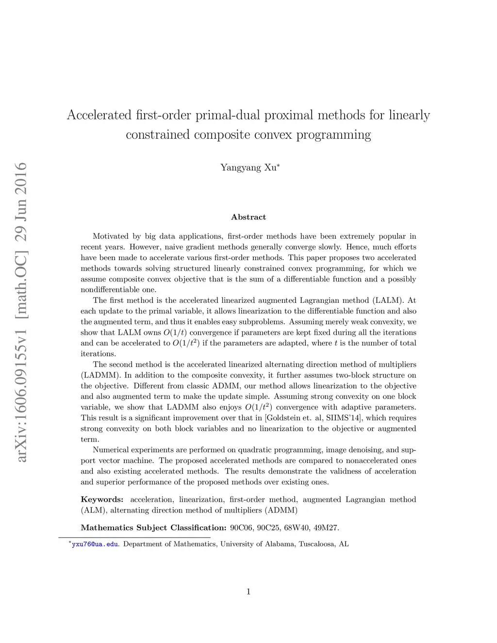 Motivated by big data applications, first-order methods have been extremely popular in recent years. However, naive gradient methods generally converge slowly. Hence, much efforts have been made to accelerate various first-order methods. This paper proposes two accelerated methods towards solving structured linearly constrained convex programming, for which we assume composite convex objective. The first method is the accelerated linearized augmented Lagrangian method (LALM). At each update to the primal variable, it allows linearization to the differentiable function and also the augmented term, and thus it enables easy subproblems. Assuming merely weak convexity, we show that LALM owns convergence if parameters are kept fixed during all the iterations and can be accelerated to if the parameters are adapted, where is the number of total iterations. The second method is the accelerated linearized alternating direction method of multipliers (LADMM). In addition to the composite convexity, it further assumes two-block structure on the objective. Different from classic ADMM, our method allows linearization to the objective and also augmented term to make the update simple. Assuming strong convexity on one block variable, we show that LADMM also enjoys convergence with adaptive parameters. This result is a significant improvement over that in [Goldstein et. al, SIIMS'14], which requires strong convexity on both block variables and no linearization to the objective or augmented term. Numerical experiments are performed on quadratic programming, image denoising, and support vector machine. The proposed accelerated methods are compared to nonaccelerated ones and also existing accelerated methods. The results demonstrate the validness of acceleration and superior performance of the proposed methods over existing ones.
