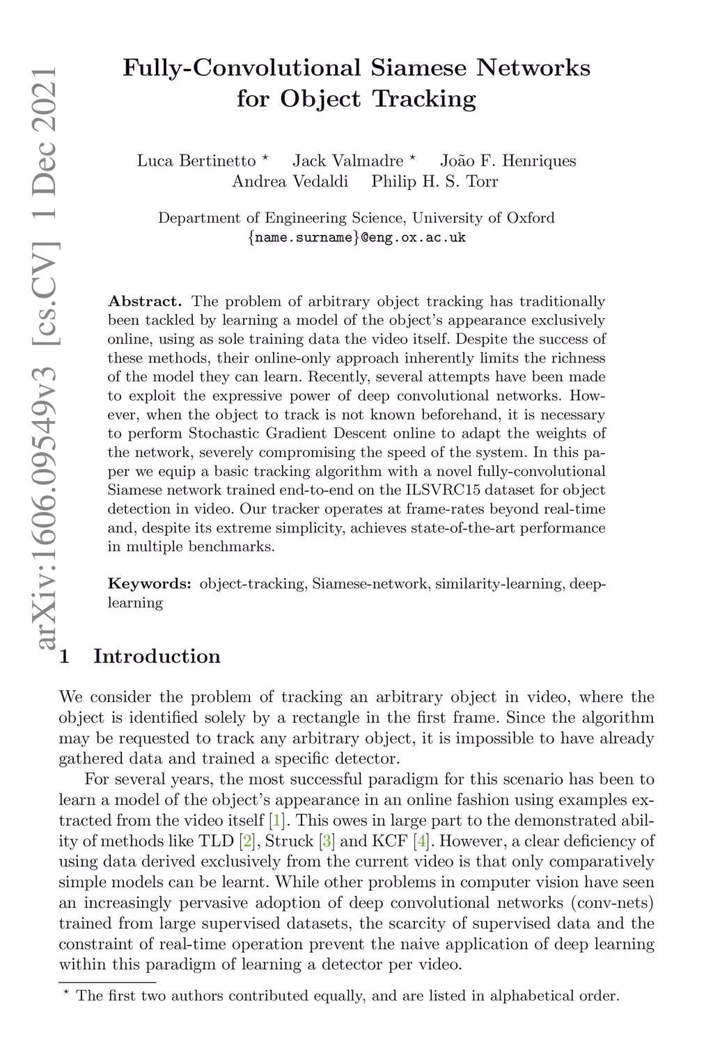 The problem of arbitrary object tracking has traditionally been tackled by learning a model of the object's appearance exclusively online, using as sole training data the video itself. Despite the success of these methods, their online-only approach inherently limits the richness of the model they can learn. Recently, several attempts have been made to exploit the expressive power of deep convolutional networks. However, when the object to track is not known beforehand, it is necessary to perform Stochastic Gradient Descent online to adapt the weights of the network, severely compromising the speed of the system. In this paper we equip a basic tracking algorithm with a novel fully-convolutional Siamese network trained end-to-end on the ILSVRC15 dataset for object detection in video. Our tracker operates at frame-rates beyond real-time and, despite its extreme simplicity, achieves state-of-the-art performance in multiple benchmarks.