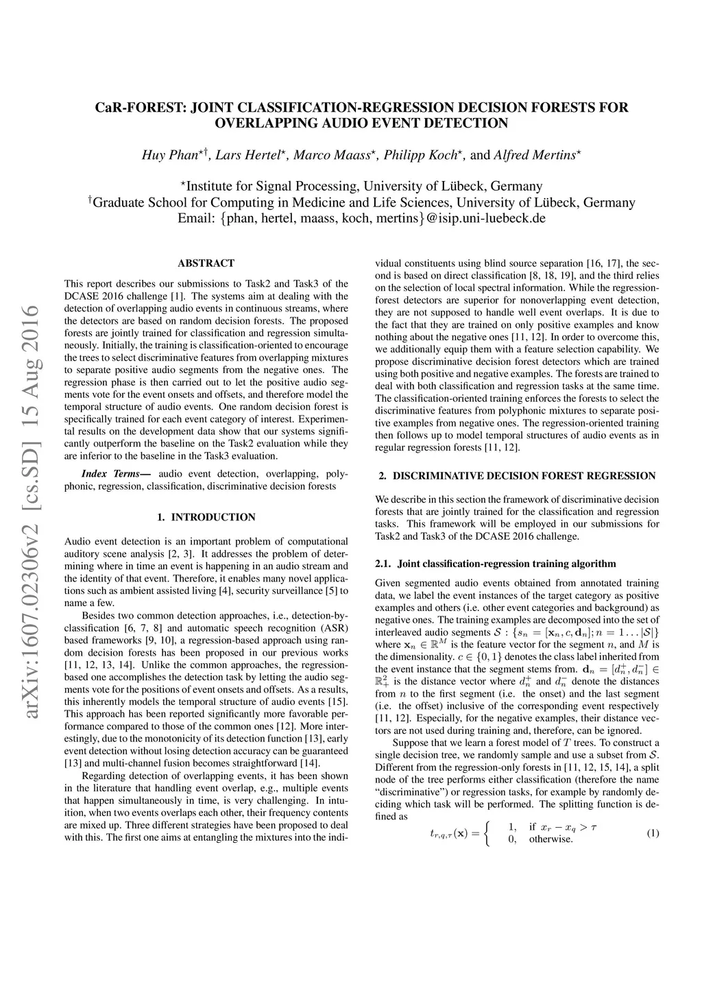 This report describes our submissions to Task2 and Task3 of the DCASE 2016 challenge. The systems aim at dealing with the detection of overlapping audio events in continuous streams, where the detectors are based on random decision forests. The proposed forests are jointly trained for classification and regression simultaneously. Initially, the training is classification-oriented to encourage the trees to select discriminative features from overlapping mixtures to separate positive audio segments from the negative ones. The regression phase is then carried out to let the positive audio segments vote for the event onsets and offsets, and therefore model the temporal structure of audio events. One random decision forest is specifically trained for each event category of interest. Experimental results on the development data show that our systems significantly outperform the baseline on the Task2 evaluation while they are inferior to the baseline in the Task3 evaluation.