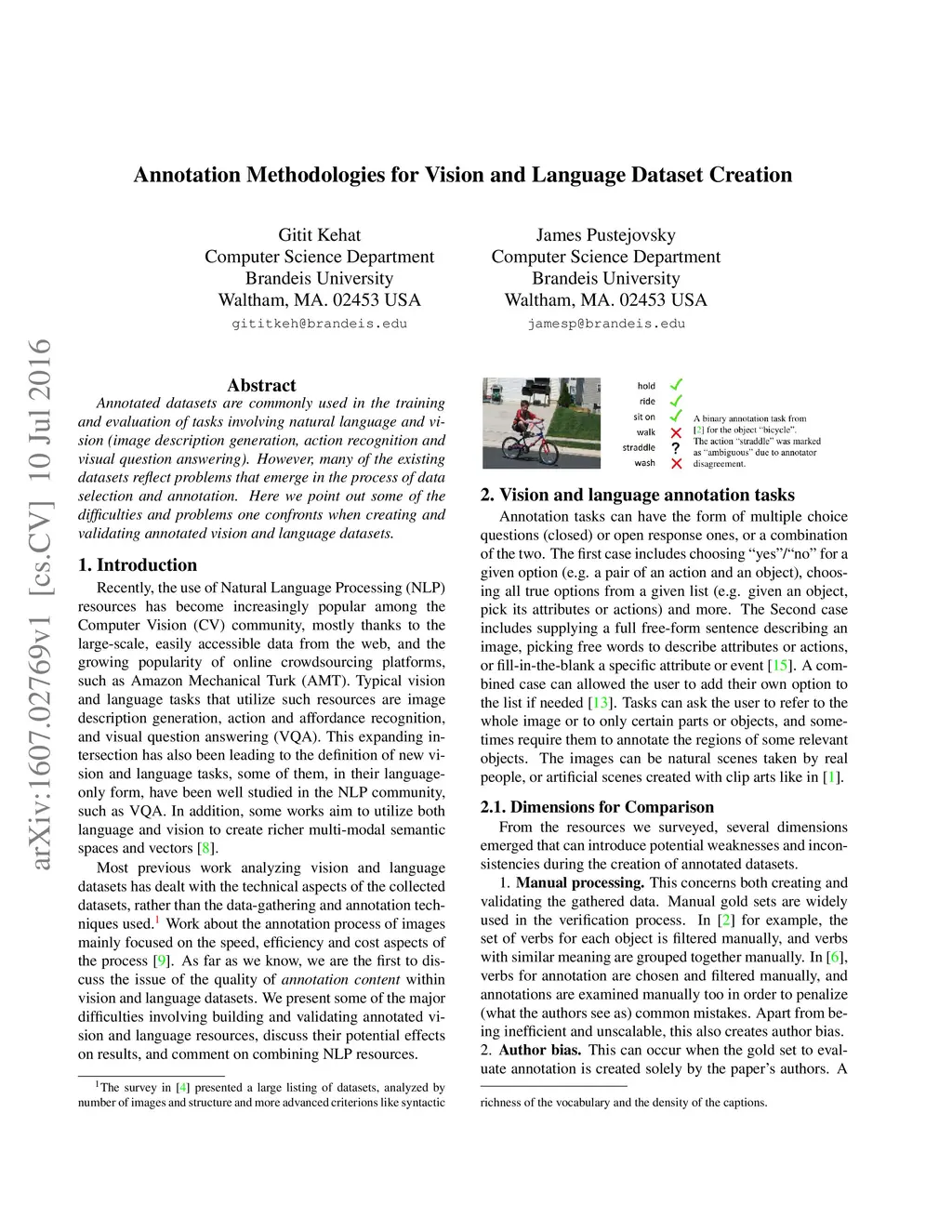 Annotated datasets are commonly used in the training and evaluation of tasks involving natural language and vision (image description generation, action recognition and visual question answering). However, many of the existing datasets reflect problems that emerge in the process of data selection and annotation. Here we point out some of the difficulties and problems one confronts when creating and validating annotated vision and language datasets.