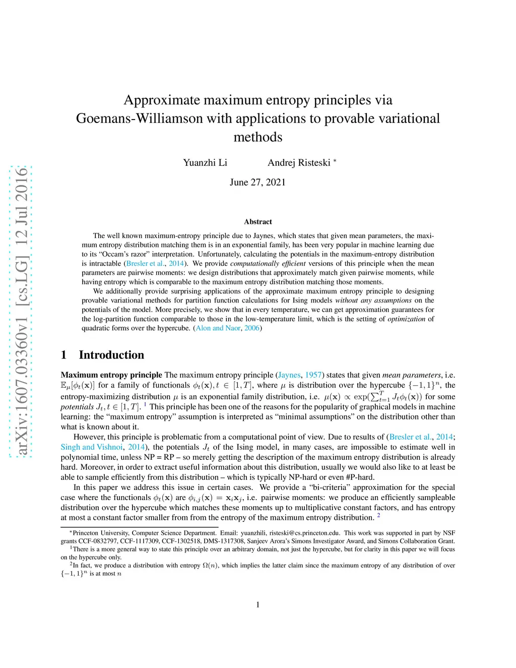 The well known maximum-entropy principle due to Jaynes, which states that given mean parameters, the maximum entropy distribution matching them is in an exponential family, has been very popular in machine learning due to its "Occam's razor" interpretation. Unfortunately, calculating the potentials in the maximum-entropy distribution is intractable \cite{bresler2014hardness}. We provide computationally efficient versions of this principle when the mean parameters are pairwise moments: we design distributions that approximately match given pairwise moments, while having entropy which is comparable to the maximum entropy distribution matching those moments. We additionally provide surprising applications of the approximate maximum entropy principle to designing provable variational methods for partition function calculations for Ising models without any assumptions on the potentials of the model. More precisely, we show that in every temperature, we can get approximation guarantees for the log-partition function comparable to those in the low-temperature limit, which is the setting of optimization of quadratic forms over the hypercube. \cite{alon2006approximating}