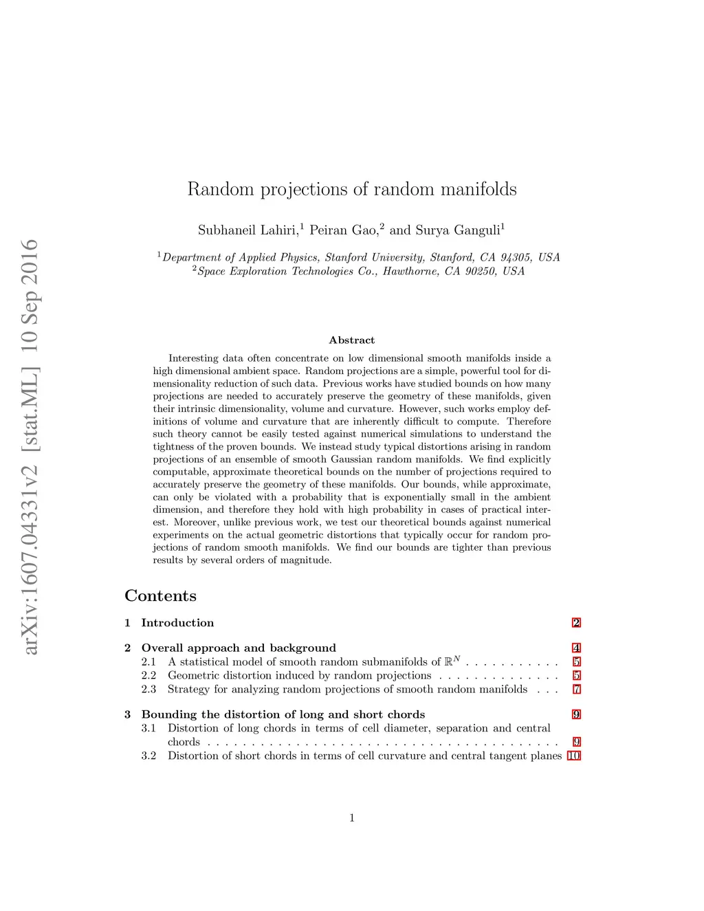 Interesting data often concentrate on low dimensional smooth manifolds inside a high dimensional ambient space. Random projections are a simple, powerful tool for dimensionality reduction of such data. Previous works have studied bounds on how many projections are needed to accurately preserve the geometry of these manifolds, given their intrinsic dimensionality, volume and curvature. However, such works employ definitions of volume and curvature that are inherently difficult to compute. Therefore such theory cannot be easily tested against numerical simulations to understand the tightness of the proven bounds. We instead study typical distortions arising in random projections of an ensemble of smooth Gaussian random manifolds. We find explicitly computable, approximate theoretical bounds on the number of projections required to accurately preserve the geometry of these manifolds. Our bounds, while approximate, can only be violated with a probability that is exponentially small in the ambient dimension, and therefore they hold with high probability in cases of practical interest. Moreover, unlike previous work, we test our theoretical bounds against numerical experiments on the actual geometric distortions that typically occur for random projections of random smooth manifolds. We find our bounds are tighter than previous results by several orders of magnitude.