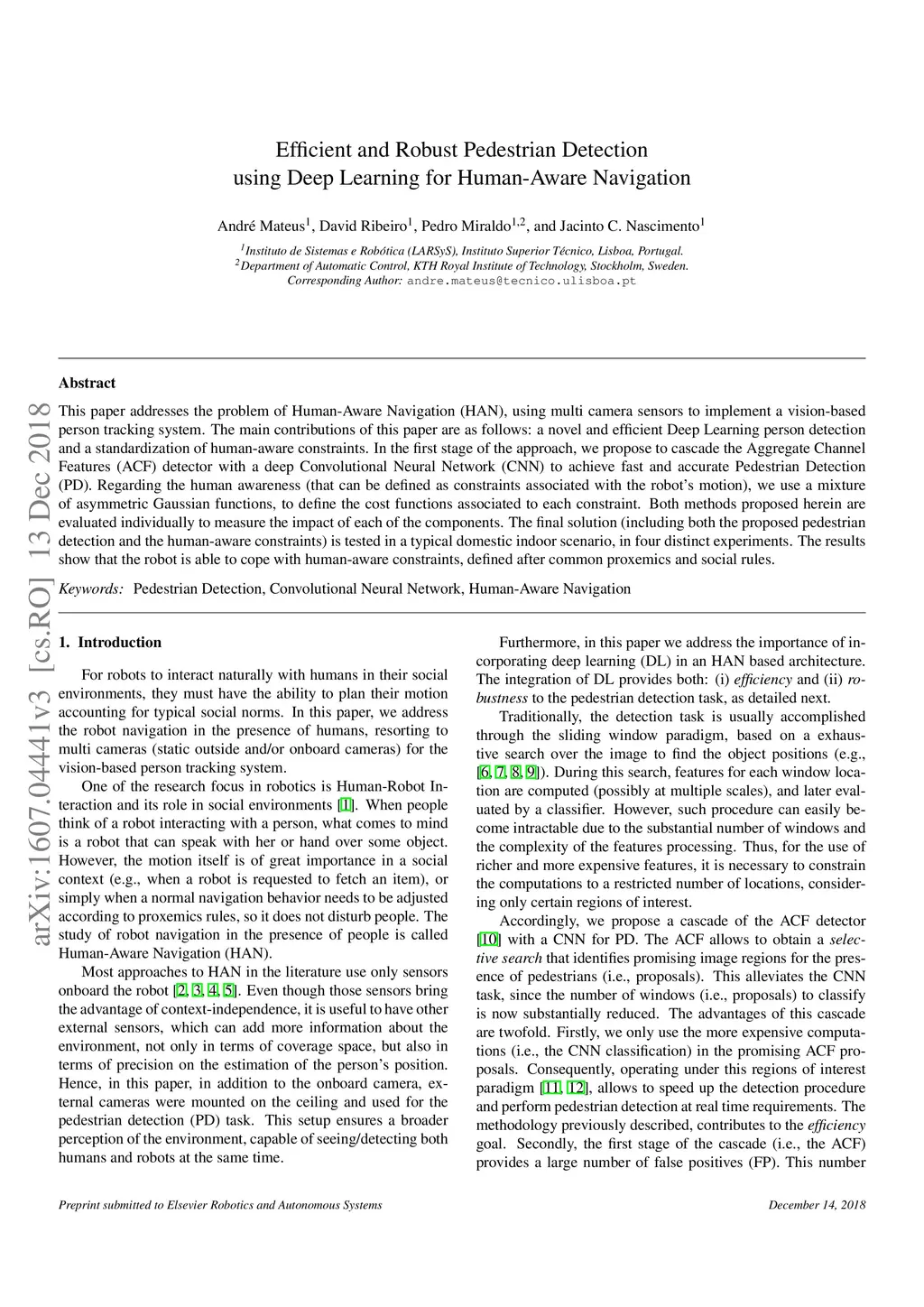 This paper addresses the problem of Human-Aware Navigation (HAN), using multi camera sensors to implement a vision-based person tracking system. The main contributions of this paper are as follows: a novel and efficient Deep Learning person detection and a standardization of human-aware constraints. In the first stage of the approach, we propose to cascade the Aggregate Channel Features (ACF) detector with a deep Convolutional Neural Network (CNN) to achieve fast and accurate Pedestrian Detection (PD). Regarding the human awareness (that can be defined as constraints associated with the robot's motion), we use a mixture of asymmetric Gaussian functions, to define the cost functions associated to each constraint. Both methods proposed herein are evaluated individually to measure the impact of each of the components. The final solution (including both the proposed pedestrian detection and the human-aware constraints) is tested in a typical domestic indoor scenario, in four distinct experiments. The results show that the robot is able to cope with human-aware constraints, defined after common proxemics and social rules.