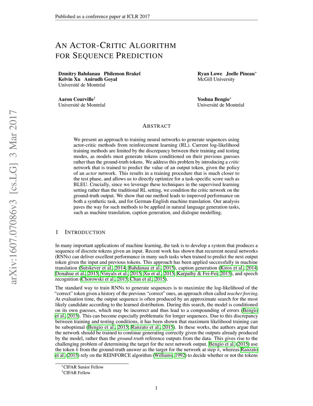 We present an approach to training neural networks to generate sequences using actor-critic methods from reinforcement learning (RL). Current log-likelihood training methods are limited by the discrepancy between their training and testing modes, as models must generate tokens conditioned on their previous guesses rather than the ground-truth tokens. We address this problem by introducing a \textit{critic} network that is trained to predict the value of an output token, given the policy of an \textit{actor} network. This results in a training procedure that is much closer to the test phase, and allows us to directly optimize for a task-specific score such as BLEU. Crucially, since we leverage these techniques in the supervised learning setting rather than the traditional RL setting, we condition the critic network on the ground-truth output. We show that our method leads to improved performance on both a synthetic task, and for German-English machine translation. Our analysis paves the way for such methods to be applied in natural language generation tasks, such as machine translation, caption generation, and dialogue modelling.