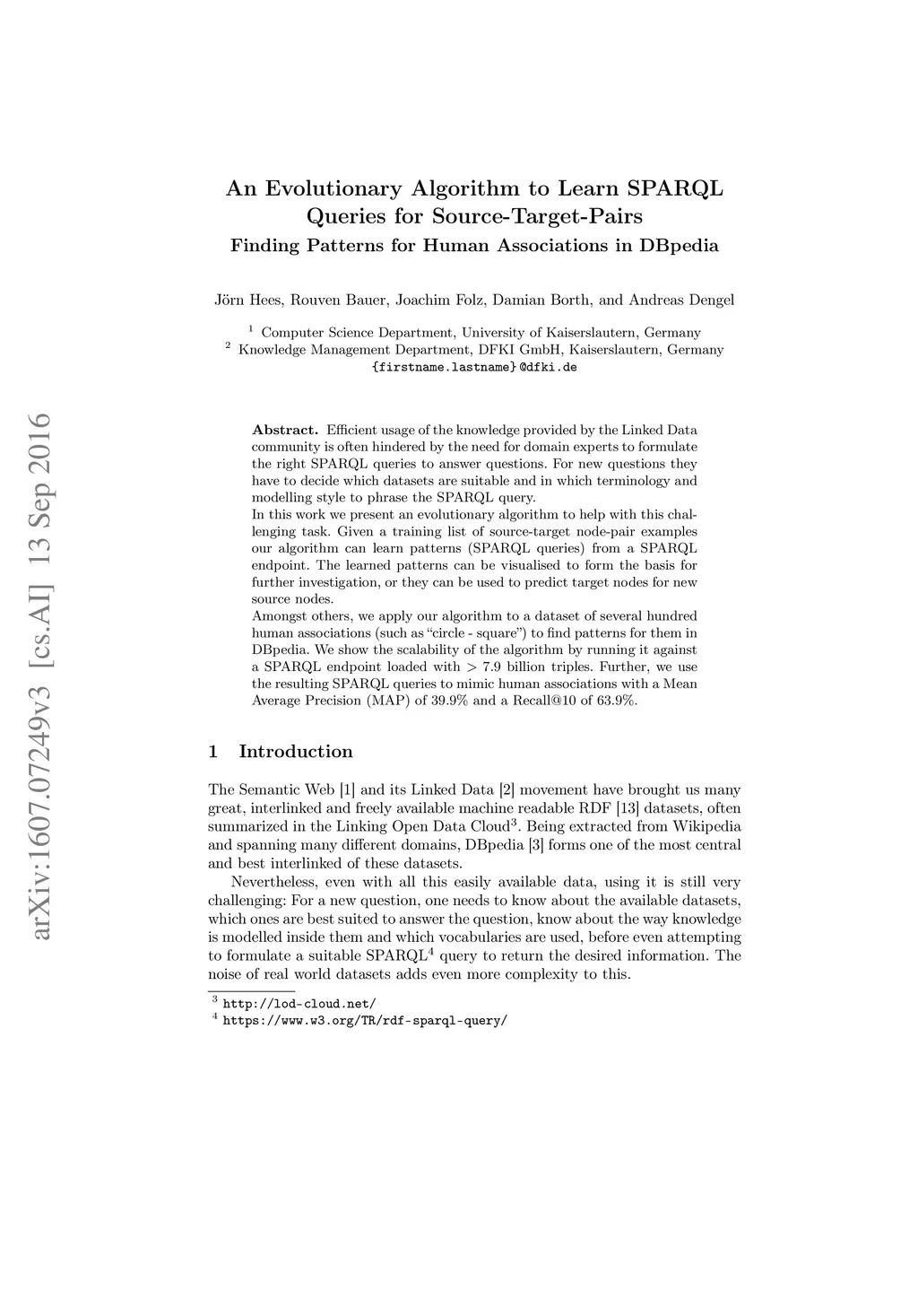 Efficient usage of the knowledge provided by the Linked Data community is often hindered by the need for domain experts to formulate the right SPARQL queries to answer questions. For new questions they have to decide which datasets are suitable and in which terminology and modelling style to phrase the SPARQL query. In this work we present an evolutionary algorithm to help with this challenging task. Given a training list of source-target node-pair examples our algorithm can learn patterns (SPARQL queries) from a SPARQL endpoint. The learned patterns can be visualised to form the basis for further investigation, or they can be used to predict target nodes for new source nodes. Amongst others, we apply our algorithm to a dataset of several hundred human associations (such as "circle - square") to find patterns for them in DBpedia. We show the scalability of the algorithm by running it against a SPARQL endpoint loaded with > 7.9 billion triples. Further, we use the resulting SPARQL queries to mimic human associations with a Mean Average Precision (MAP) of 39.9 % and a Recall@10 of 63.9 %.