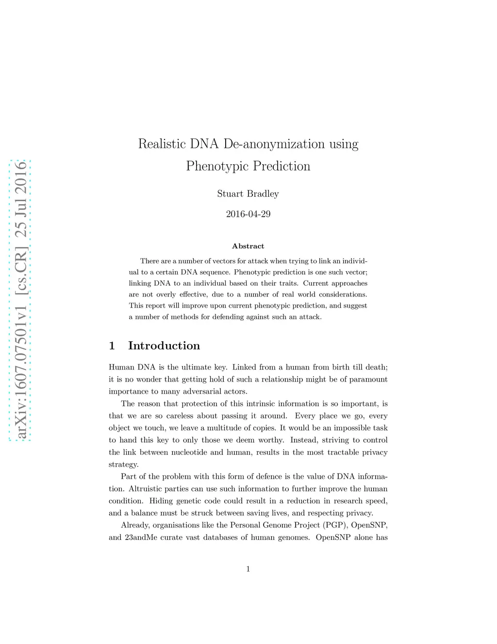 There are a number of vectors for attack when trying to link an individual to a certain DNA sequence. Phenotypic prediction is one such vector; linking DNA to an individual based on their traits. Current approaches are not overly effective, due to a number of real world considerations. This report will improve upon current phenotypic prediction, and suggest a number of methods for defending against such an attack.