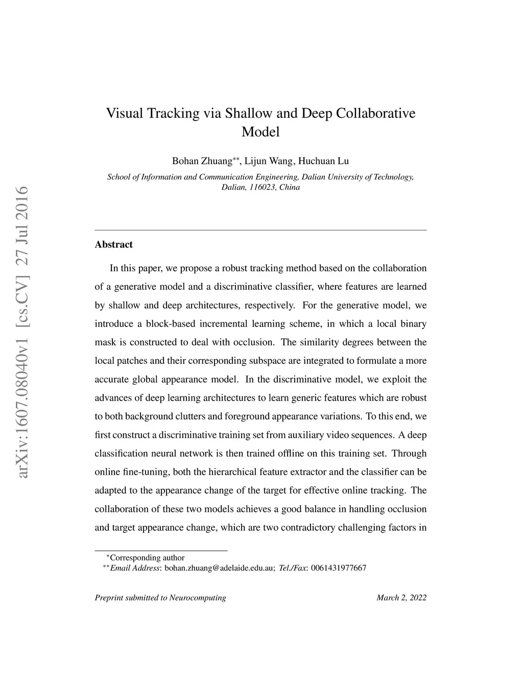 In this paper, we propose a robust tracking method based on the collaboration of a generative model and a discriminative classifier, where features are learned by shallow and deep architectures, respectively. For the generative model, we introduce a block-based incremental learning scheme, in which a local binary mask is constructed to deal with occlusion. The similarity degrees between the local patches and their corresponding subspace are integrated to formulate a more accurate global appearance model. In the discriminative model, we exploit the advances of deep learning architectures to learn generic features which are robust to both background clutters and foreground appearance variations. To this end, we first construct a discriminative training set from auxiliary video sequences. A deep classification neural network is then trained offline on this training set. Through online fine-tuning, both the hierarchical feature extractor and the classifier can be adapted to the appearance change of the target for effective online tracking. The collaboration of these two models achieves a good balance in handling occlusion and target appearance change, which are two contradictory challenging factors in visual tracking. Both quantitative and qualitative evaluations against several state-of-the-art algorithms on challenging image sequences demonstrate the accuracy and the robustness of the proposed tracker.