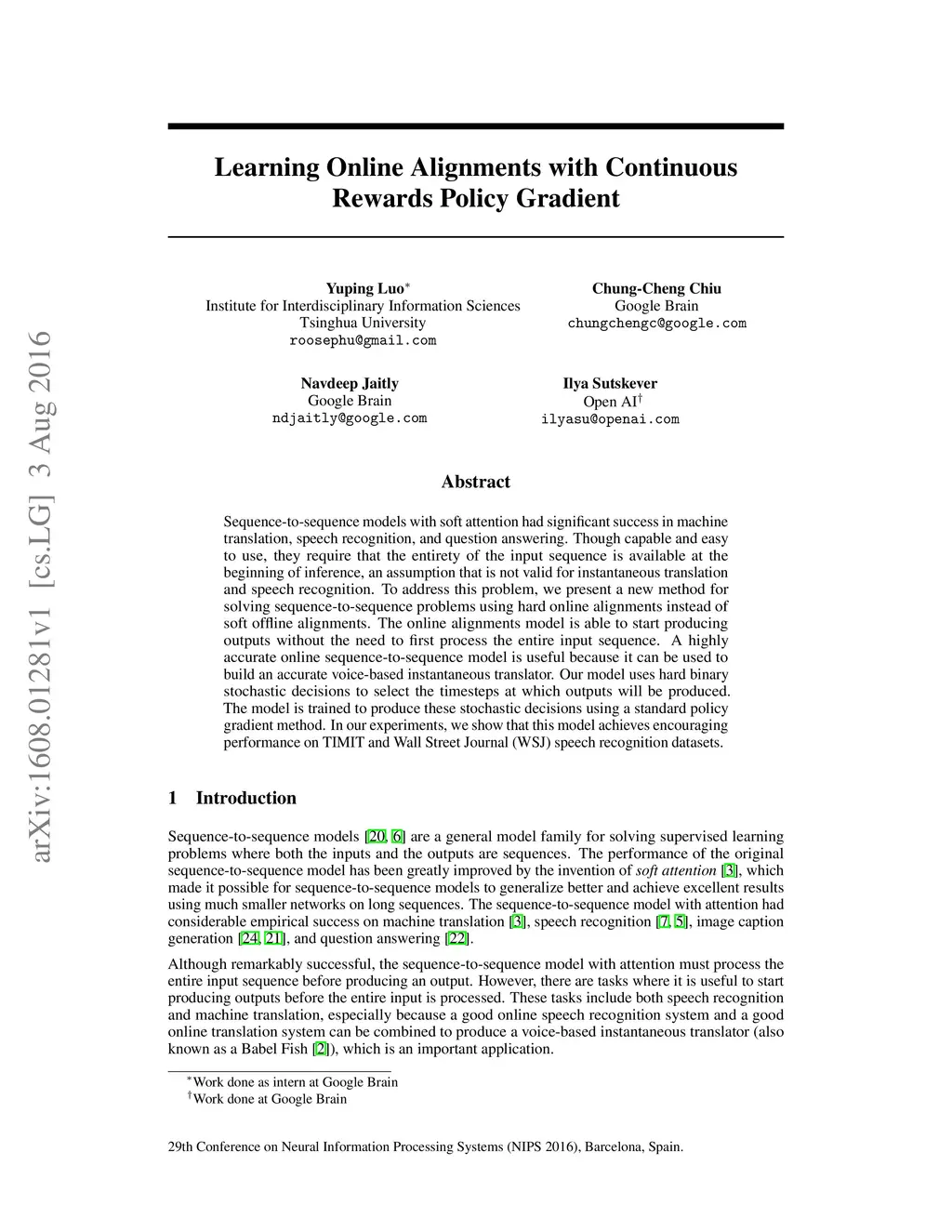 Sequence-to-sequence models with soft attention had significant success in machine translation, speech recognition, and question answering. Though capable and easy to use, they require that the entirety of the input sequence is available at the beginning of inference, an assumption that is not valid for instantaneous translation and speech recognition. To address this problem, we present a new method for solving sequence-to-sequence problems using hard online alignments instead of soft offline alignments. The online alignments model is able to start producing outputs without the need to first process the entire input sequence. A highly accurate online sequence-to-sequence model is useful because it can be used to build an accurate voice-based instantaneous translator. Our model uses hard binary stochastic decisions to select the timesteps at which outputs will be produced. The model is trained to produce these stochastic decisions using a standard policy gradient method. In our experiments, we show that this model achieves encouraging performance on TIMIT and Wall Street Journal (WSJ) speech recognition datasets.