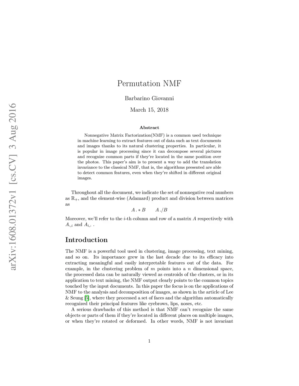 Nonnegative Matrix Factorization(NMF) is a common used technique in machine learning to extract features out of data such as text documents and images thanks to its natural clustering properties. In particular, it is popular in image processing since it can decompose several pictures and recognize common parts if they're located in the same position over the photos. This paper's aim is to present a way to add the translation invariance to the classical NMF, that is, the algorithms presented are able to detect common features, even when they're shifted, in different original images.