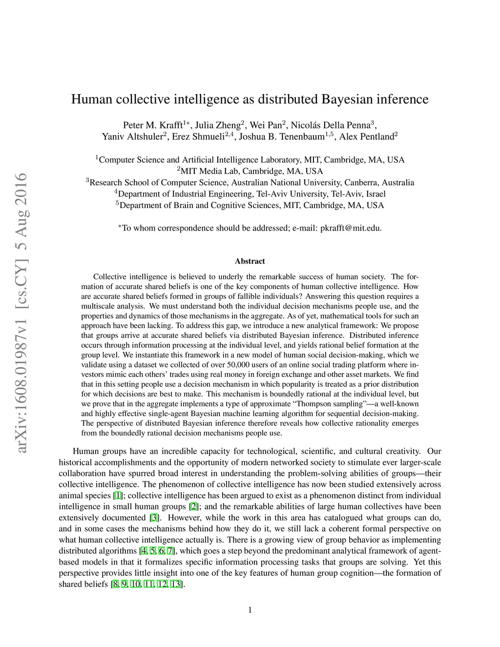 Collective intelligence is believed to underly the remarkable success of human society. The formation of accurate shared beliefs is one of the key components of human collective intelligence. How are accurate shared beliefs formed in groups of fallible individuals? Answering this question requires a multiscale analysis. We must understand both the individual decision mechanisms people use, and the properties and dynamics of those mechanisms in the aggregate. As of yet, mathematical tools for such an approach have been lacking. To address this gap, we introduce a new analytical framework: We propose that groups arrive at accurate shared beliefs via distributed Bayesian inference. Distributed inference occurs through information processing at the individual level, and yields rational belief formation at the group level. We instantiate this framework in a new model of human social decision-making, which we validate using a dataset we collected of over 50,000 users of an online social trading platform where investors mimic each others' trades using real money in foreign exchange and other asset markets. We find that in this setting people use a decision mechanism in which popularity is treated as a prior distribution for which decisions are best to make. This mechanism is boundedly rational at the individual level, but we prove that in the aggregate implements a type of approximate "Thompson sampling"---a well-known and highly effective single-agent Bayesian machine learning algorithm for sequential decision-making. The perspective of distributed Bayesian inference therefore reveals how collective rationality emerges from the boundedly rational decision mechanisms people use.