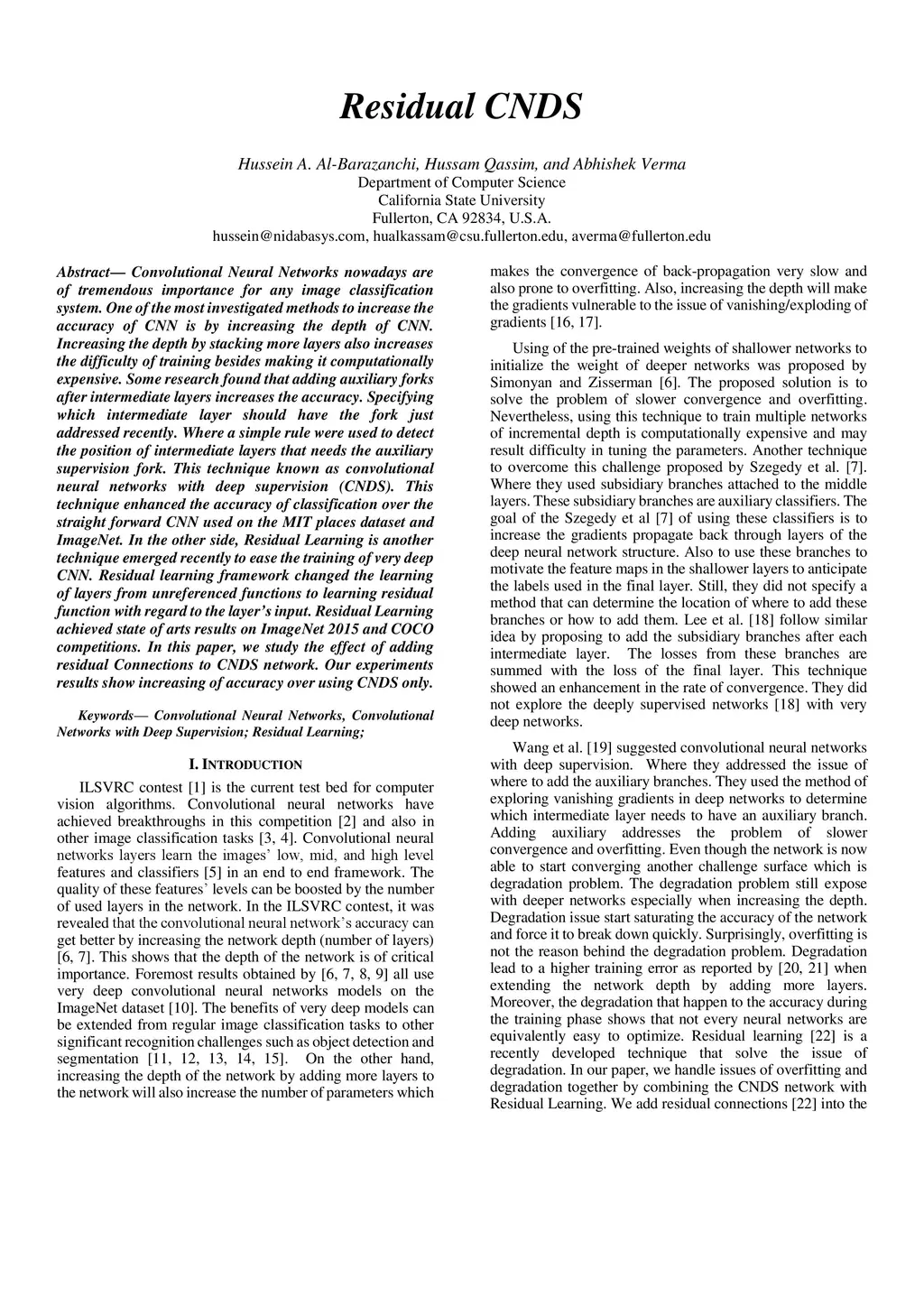 Convolutional Neural networks nowadays are of tremendous importance for any image classification system. One of the most investigated methods to increase the accuracy of CNN is by increasing the depth of CNN. Increasing the depth by stacking more layers also increases the difficulty of training besides making it computationally expensive. Some research found that adding auxiliary forks after intermediate layers increases the accuracy. Specifying which intermediate layer shoud have the fork just addressed recently. Where a simple rule were used to detect the position of intermediate layers that needs the auxiliary supervision fork. This technique known as convolutional neural networks with deep supervision (CNDS). This technique enhanced the accuracy of classification over the straight forward CNN used on the MIT places dataset and ImageNet. In the other side, Residual Learning is another technique emerged recently to ease the training of very deep CNN. Residual Learning framwork changed the learning of layers from unreferenced functions to learning residual function with regard to the layer's input. Residual Learning achieved state of arts results on ImageNet 2015 and COCO competitions. In this paper, we study the effect of adding residual connections to CNDS network. Our experiments results show increasing of accuracy over using CNDS only.