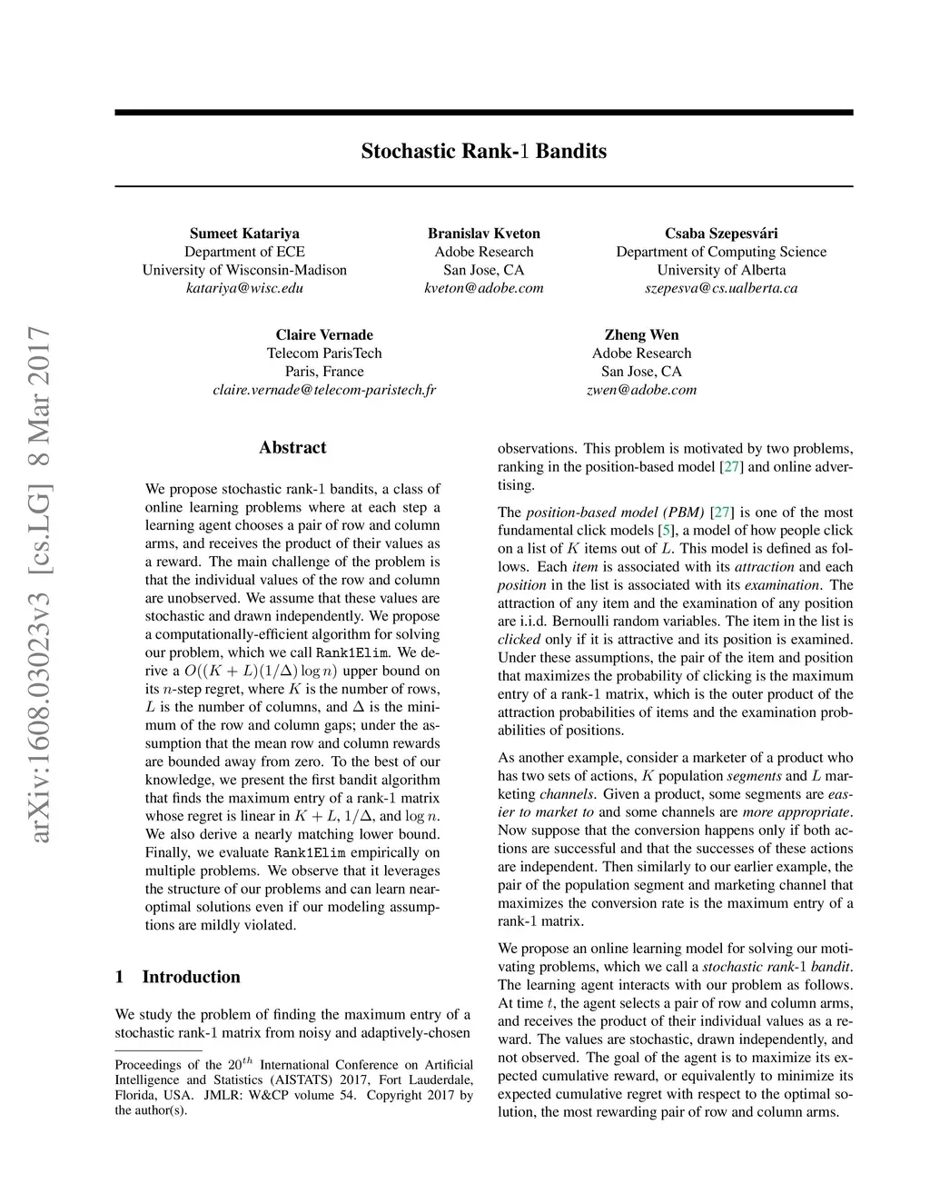 We propose stochastic rank- bandits, a class of online learning problems where at each step a learning agent chooses a pair of row and column arms, and receives the product of their values as a reward. The main challenge of the problem is that the individual values of the row and column are unobserved. We assume that these values are stochastic and drawn independently. We propose a computationally-efficient algorithm for solving our problem, which we call Rank1Elim. We derive a upper bound on its -step regret, where is the number of rows, is the number of columns, and is the minimum of the row and column gaps; under the assumption that the mean row and column rewards are bounded away from zero. To the best of our knowledge, we present the first bandit algorithm that finds the maximum entry of a rank- matrix whose regret is linear in , , and . We also derive a nearly matching lower bound. Finally, we evaluate Rank1Elim empirically on multiple problems. We observe that it leverages the structure of our problems and can learn near-optimal solutions even if our modeling assumptions are mildly violated.
