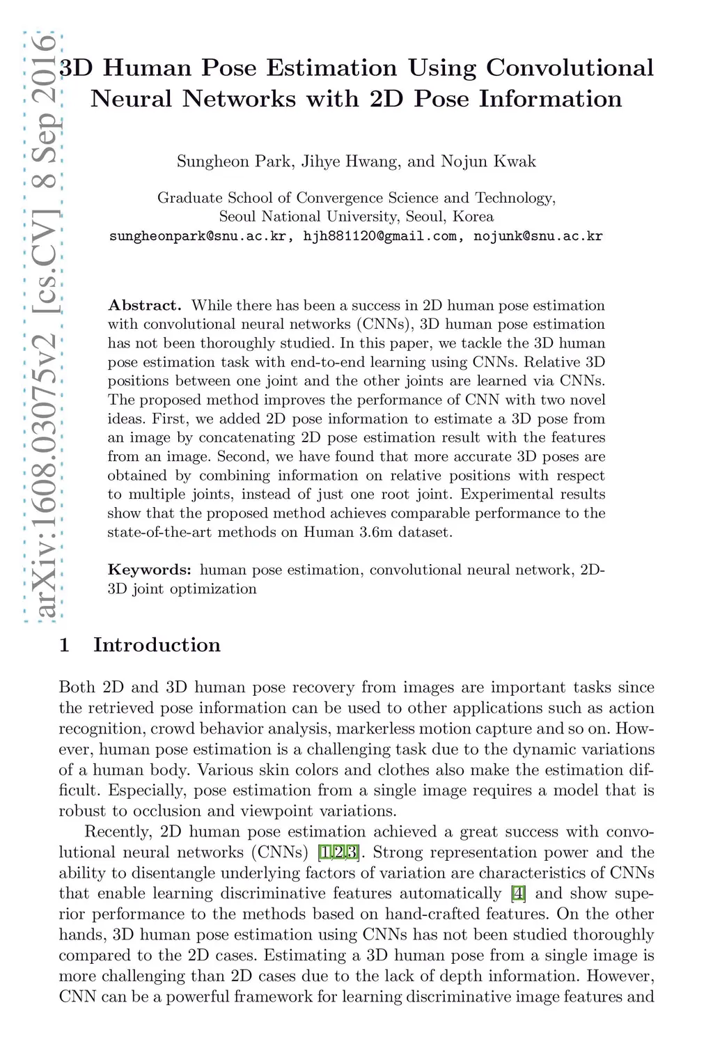 3D Human Pose Estimation Using Convolutional Neural Networks with 2D
