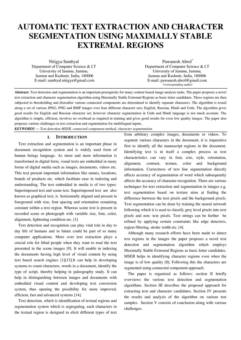 Text detection and segmentation is an important prerequisite for many content based image analysis tasks. The paper proposes a novel text extraction and character segmentation algorithm using Maximally Stable Extremal Regions as basic letter candidates. These regions are then subjected to thresholding and thereafter various connected components are determined to identify separate characters. The algorithm is tested along a set of various JPEG, PNG and BMP images over four different character sets; English, Russian, Hindi and Urdu. The algorithm gives good results for English and Russian character set; however character segmentation in Urdu and Hindi language is not much accurate. The algorithm is simple, efficient, involves no overhead as required in training and gives good results for even low quality images. The paper also proposes various challenges in text extraction and segmentation for multilingual inputs.