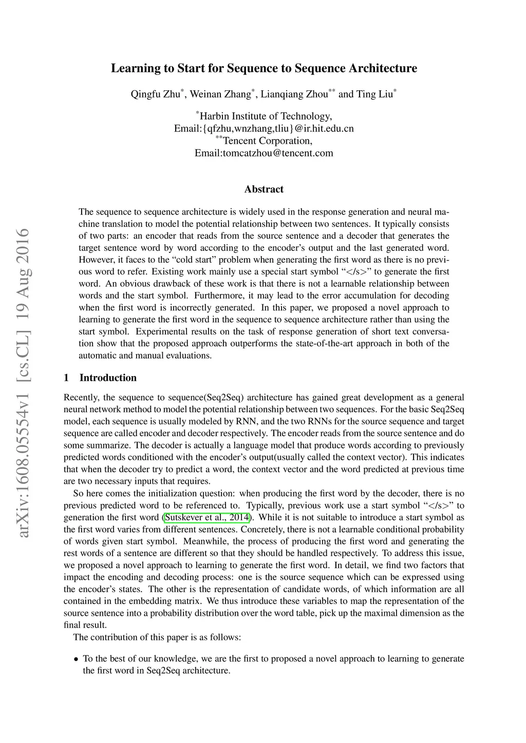 The sequence to sequence architecture is widely used in the response generation and neural machine translation to model the potential relationship between two sentences. It typically consists of two parts: an encoder that reads from the source sentence and a decoder that generates the target sentence word by word according to the encoder's output and the last generated word. However, it faces to the cold start problem when generating the first word as there is no previous word to refer. Existing work mainly use a special start symbol </s>to generate the first word. An obvious drawback of these work is that there is not a learnable relationship between words and the start symbol. Furthermore, it may lead to the error accumulation for decoding when the first word is incorrectly generated. In this paper, we proposed a novel approach to learning to generate the first word in the sequence to sequence architecture rather than using the start symbol. Experimental results on the task of response generation of short text conversation show that the proposed approach outperforms the state-of-the-art approach in both of the automatic and manual evaluations.