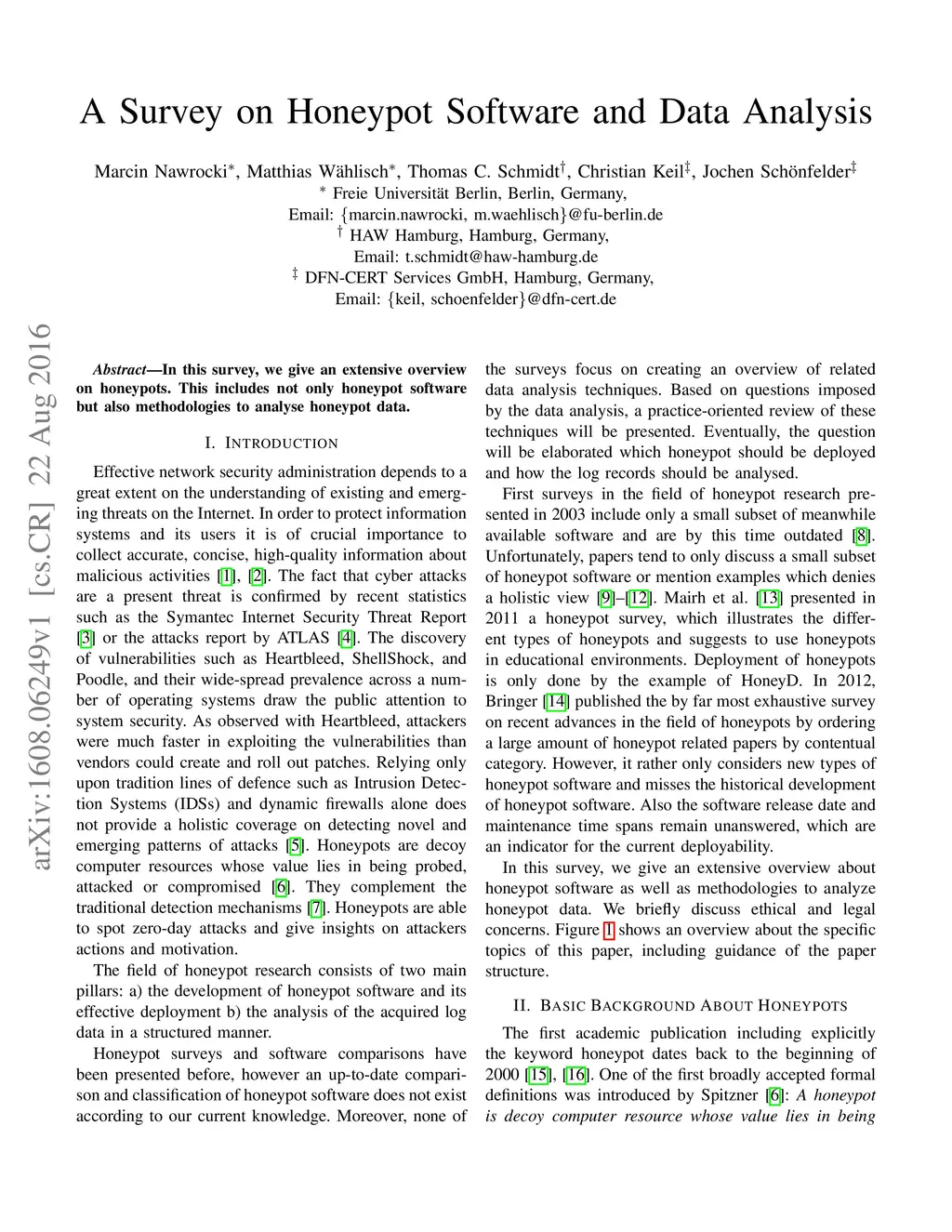 In this survey, we give an extensive overview on honeypots. This includes not only honeypot software but also methodologies to analyse honeypot data.