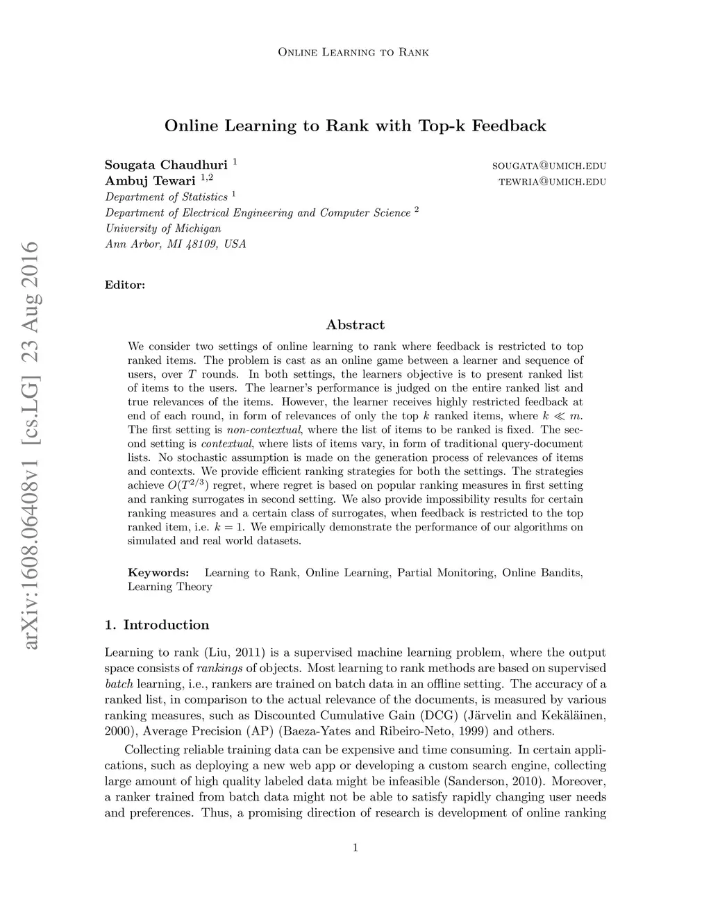 We consider two settings of online learning to rank where feedback is restricted to top ranked items. The problem is cast as an online game between a learner and sequence of users, over rounds. In both settings, the learners objective is to present ranked list of items to the users. The learner's performance is judged on the entire ranked list and true relevances of the items. However, the learner receives highly restricted feedback at end of each round, in form of relevances of only the top ranked items, where . The first setting is \emph{non-contextual}, where the list of items to be ranked is fixed. The second setting is \emph{contextual}, where lists of items vary, in form of traditional query-document lists. No stochastic assumption is made on the generation process of relevances of items and contexts. We provide efficient ranking strategies for both the settings. The strategies achieve regret, where regret is based on popular ranking measures in first setting and ranking surrogates in second setting. We also provide impossibility results for certain ranking measures and a certain class of surrogates, when feedback is restricted to the top ranked item, i.e. . We empirically demonstrate the performance of our algorithms on simulated and real world datasets.