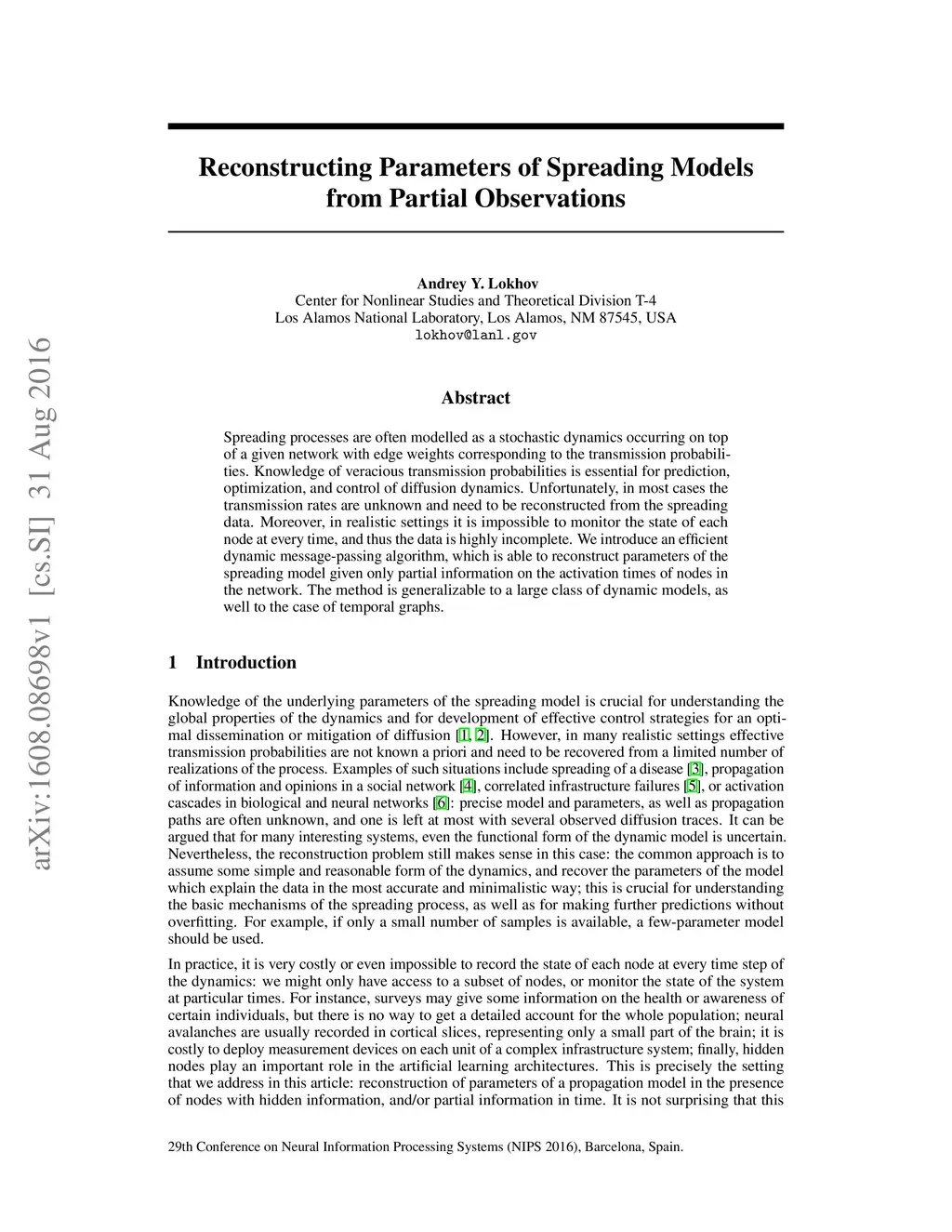 Spreading processes are often modelled as a stochastic dynamics occurring on top of a given network with edge weights corresponding to the transmission probabilities. Knowledge of veracious transmission probabilities is essential for prediction, optimization, and control of diffusion dynamics. Unfortunately, in most cases the transmission rates are unknown and need to be reconstructed from the spreading data. Moreover, in realistic settings it is impossible to monitor the state of each node at every time, and thus the data is highly incomplete. We introduce an efficient dynamic message-passing algorithm, which is able to reconstruct parameters of the spreading model given only partial information on the activation times of nodes in the network. The method is generalizable to a large class of dynamic models, as well to the case of temporal graphs.