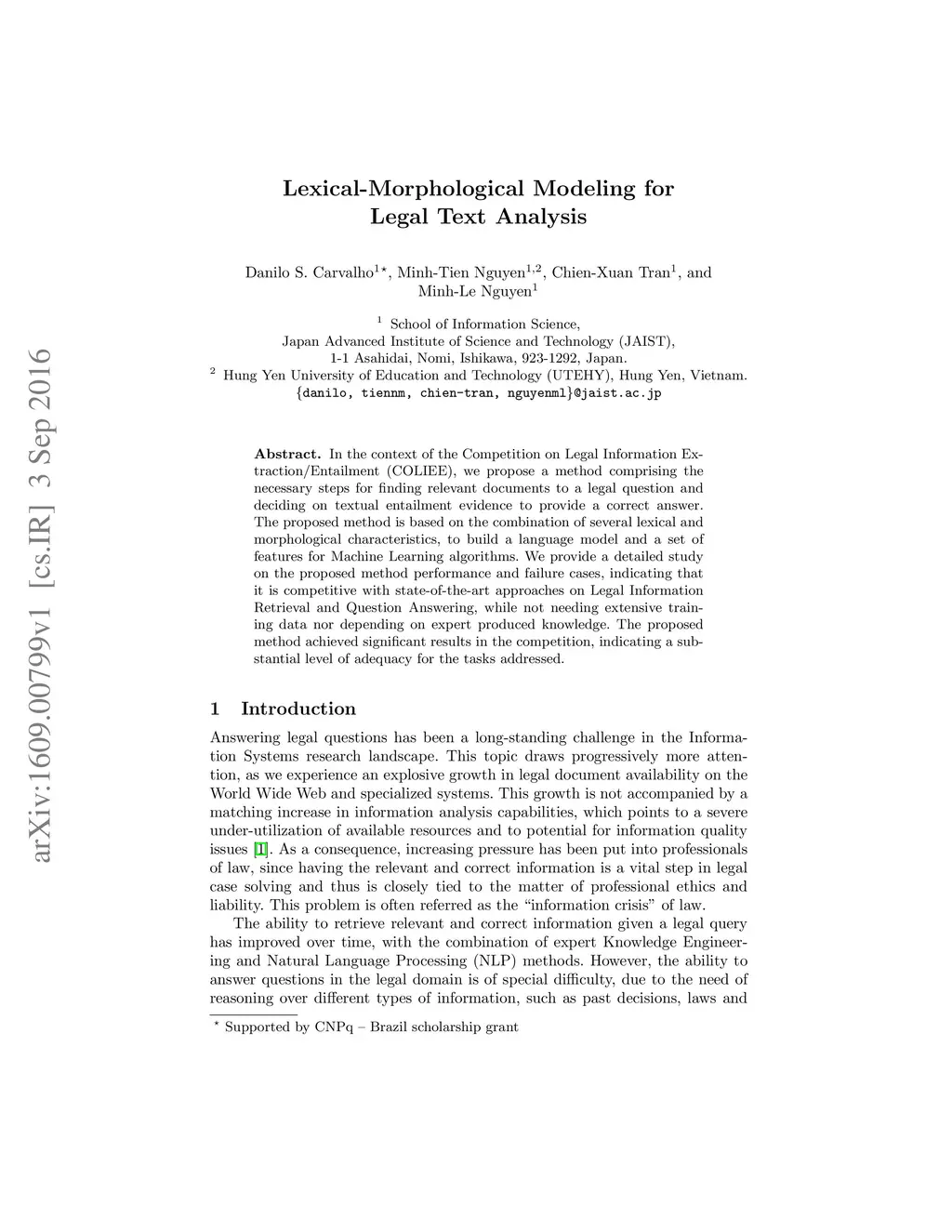 In the context of the Competition on Legal Information Extraction/Entailment (COLIEE), we propose a method comprising the necessary steps for finding relevant documents to a legal question and deciding on textual entailment evidence to provide a correct answer. The proposed method is based on the combination of several lexical and morphological characteristics, to build a language model and a set of features for Machine Learning algorithms. We provide a detailed study on the proposed method performance and failure cases, indicating that it is competitive with state-of-the-art approaches on Legal Information Retrieval and Question Answering, while not needing extensive training data nor depending on expert produced knowledge. The proposed method achieved significant results in the competition, indicating a substantial level of adequacy for the tasks addressed.