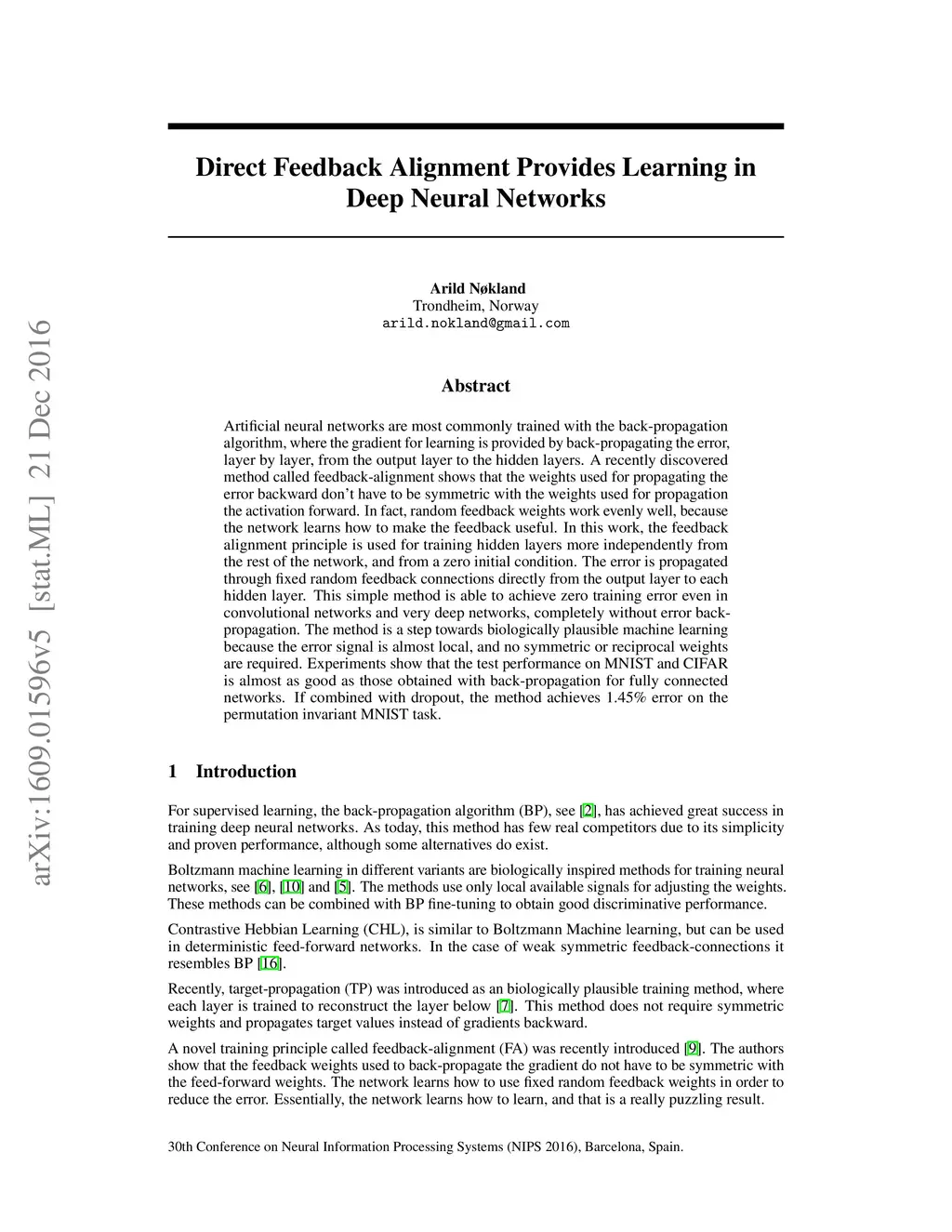 Direct Feedback Alignment Provides Learning in Deep Neural Networks