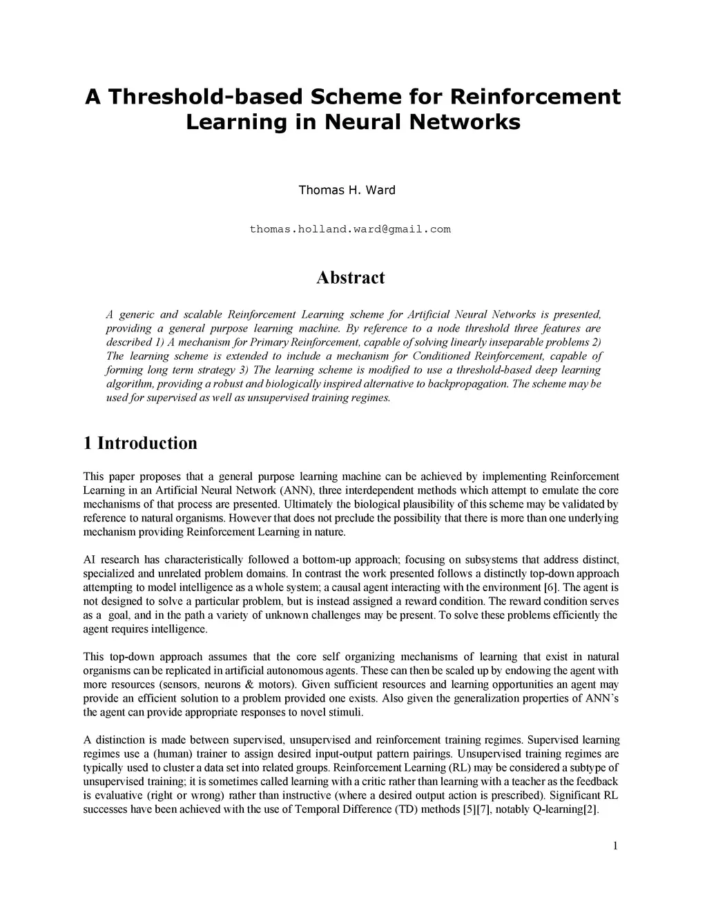 A generic and scalable Reinforcement Learning scheme for Artificial Neural Networks is presented, providing a general purpose learning machine. By reference to a node threshold three features are described 1) A mechanism for Primary Reinforcement, capable of solving linearly inseparable problems 2) The learning scheme is extended to include a mechanism for Conditioned Reinforcement, capable of forming long term strategy 3) The learning scheme is modified to use a threshold-based deep learning algorithm, providing a robust and biologically inspired alternative to backpropagation. The model may be used for supervised as well as unsupervised training regimes.