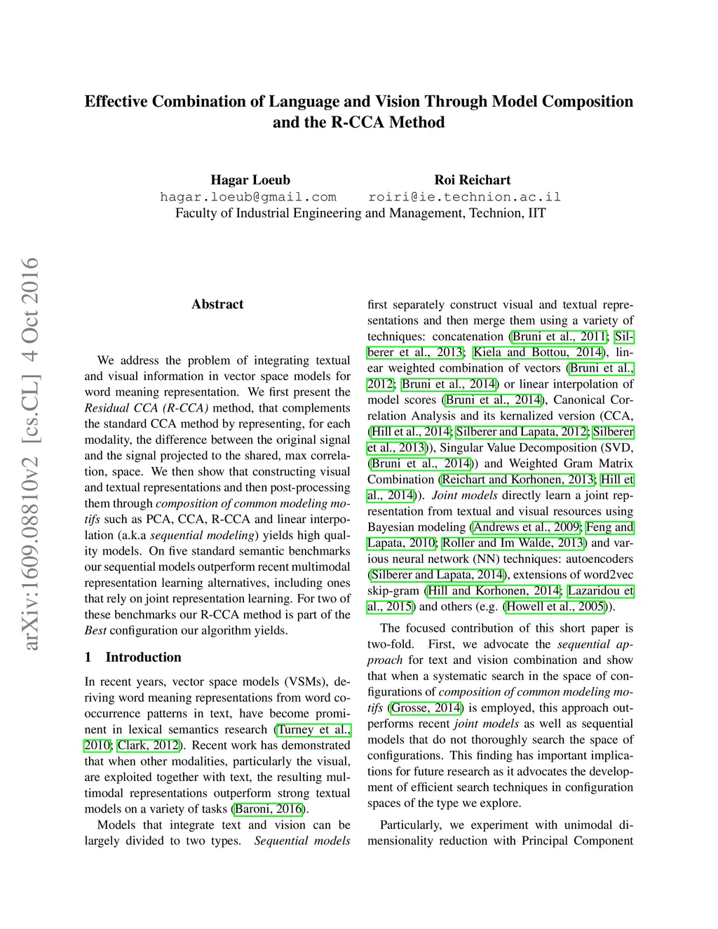 We address the problem of integrating textual and visual information in vector space models for word meaning representation. We first present the Residual CCA (R-CCA) method, that complements the standard CCA method by representing, for each modality, the difference between the original signal and the signal projected to the shared, max correlation, space. We then show that constructing visual and textual representations and then post-processing them through composition of common modeling motifs such as PCA, CCA, R-CCA and linear interpolation (a.k.a sequential modeling) yields high quality models. On five standard semantic benchmarks our sequential models outperform recent multimodal representation learning alternatives, including ones that rely on joint representation learning. For two of these benchmarks our R-CCA method is part of the Best configuration our algorithm yields.