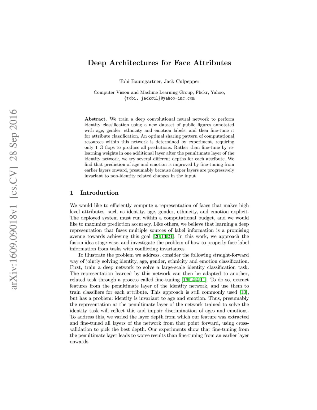We train a deep convolutional neural network to perform identity classification using a new dataset of public figures annotated with age, gender, ethnicity and emotion labels, and then fine-tune it for attribute classification. An optimal sharing pattern of computational resources within this network is determined by experiment, requiring only 1 G flops to produce all predictions. Rather than fine-tune by relearning weights in one additional layer after the penultimate layer of the identity network, we try several different depths for each attribute. We find that prediction of age and emotion is improved by fine-tuning from earlier layers onward, presumably because deeper layers are progressively invariant to non-identity related changes in the input.