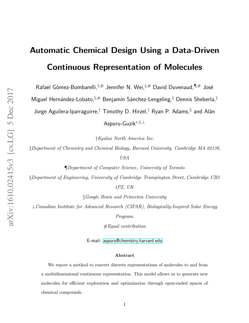We report a method to convert discrete representations of molecules to and from a multidimensional continuous representation. This model allows us to generate new molecules for efficient exploration and optimization through open-ended spaces of chemical compounds. A deep neural network was trained on hundreds of thousands of existing chemical structures to construct three coupled functions: an encoder, a decoder and a predictor. The encoder converts the discrete representation of a molecule into a real-valued continuous vector, and the decoder converts these continuous vectors back to discrete molecular representations. The predictor estimates chemical properties from the latent continuous vector representation of the molecule. Continuous representations allow us to automatically generate novel chemical structures by performing simple operations in the latent space, such as decoding random vectors, perturbing known chemical structures, or interpolating between molecules. Continuous representations also allow the use of powerful gradient-based optimization to efficiently guide the search for optimized functional compounds. We demonstrate our method in the domain of drug-like molecules and also in the set of molecules with fewer that nine heavy atoms.