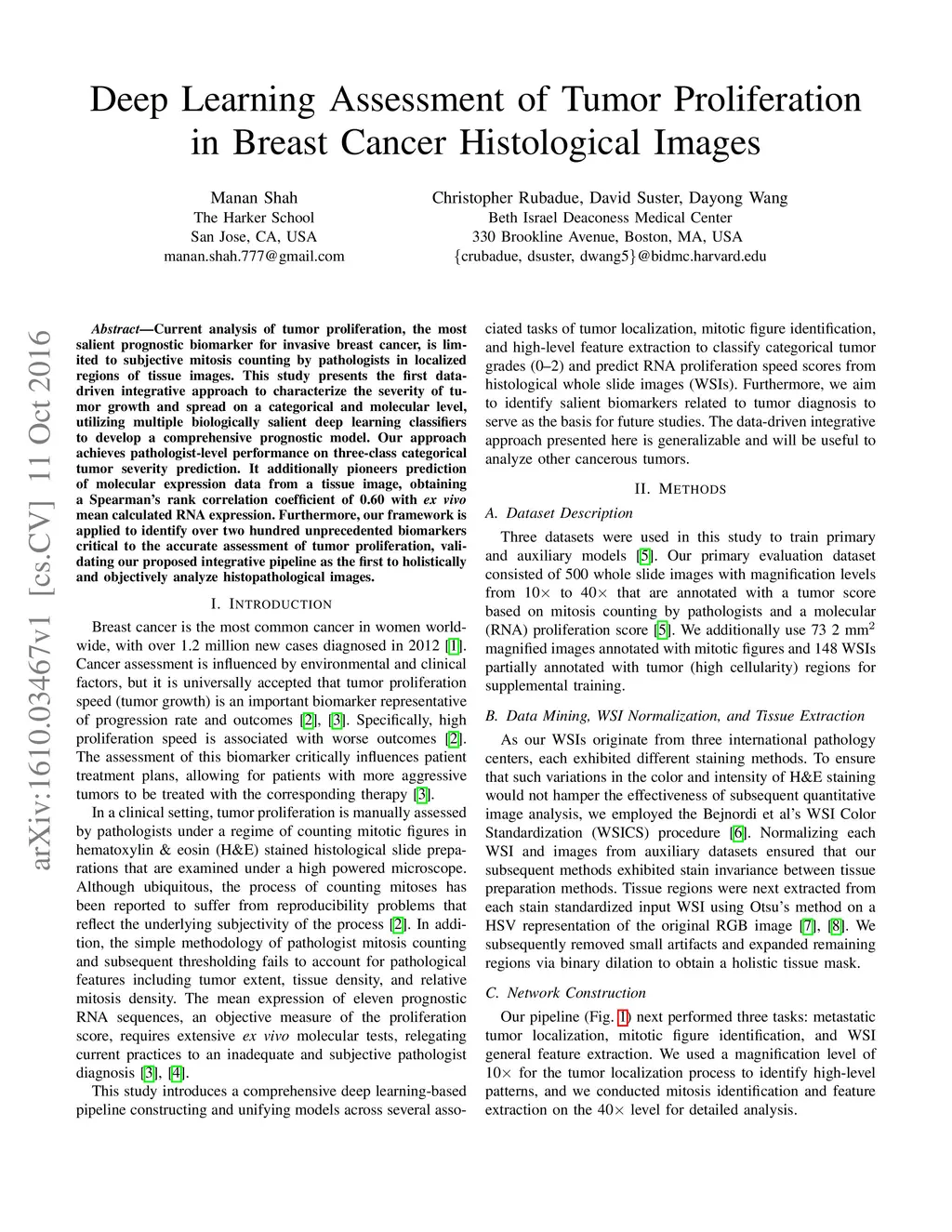 Current analysis of tumor proliferation, the most salient prognostic biomarker for invasive breast cancer, is limited to subjective mitosis counting by pathologists in localized regions of tissue images. This study presents the first data-driven integrative approach to characterize the severity of tumor growth and spread on a categorical and molecular level, utilizing multiple biologically salient deep learning classifiers to develop a comprehensive prognostic model. Our approach achieves pathologist-level performance on three-class categorical tumor severity prediction. It additionally pioneers prediction of molecular expression data from a tissue image, obtaining a Spearman's rank correlation coefficient of 0.60 with ex vivo mean calculated RNA expression. Furthermore, our framework is applied to identify over two hundred unprecedented biomarkers critical to the accurate assessment of tumor proliferation, validating our proposed integrative pipeline as the first to holistically and objectively analyze histopathological images.