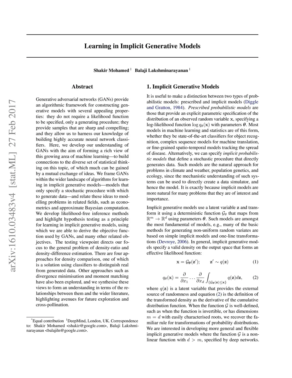 Generative adversarial networks (GANs) provide an algorithmic framework for constructing generative models with several appealing properties: they do not require a likelihood function to be specified, only a generating procedure; they provide samples that are sharp and compelling; and they allow us to harness our knowledge of building highly accurate neural network classifiers. Here, we develop our understanding of GANs with the aim of forming a rich view of this growing area of machine learning---to build connections to the diverse set of statistical thinking on this topic, of which much can be gained by a mutual exchange of ideas. We frame GANs within the wider landscape of algorithms for learning in implicit generative models--models that only specify a stochastic procedure with which to generate data--and relate these ideas to modelling problems in related fields, such as econometrics and approximate Bayesian computation. We develop likelihood-free inference methods and highlight hypothesis testing as a principle for learning in implicit generative models, using which we are able to derive the objective function used by GANs, and many other related objectives. The testing viewpoint directs our focus to the general problem of density ratio estimation. There are four approaches for density ratio estimation, one of which is a solution using classifiers to distinguish real from generated data. Other approaches such as divergence minimisation and moment matching have also been explored in the GAN literature, and we synthesise these views to form an understanding in terms of the relationships between them and the wider literature, highlighting avenues for future exploration and cross-pollination.